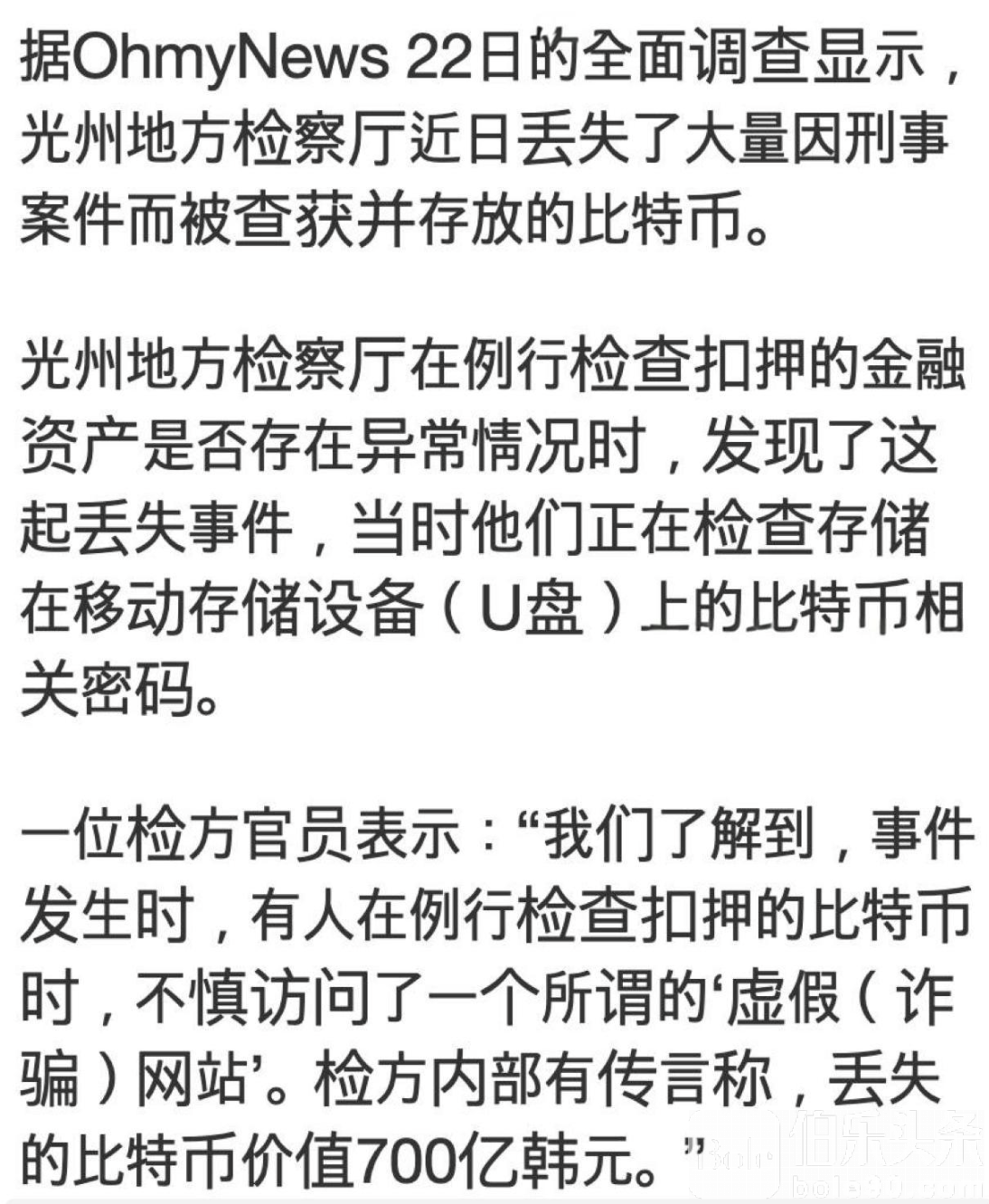 伯乐头条专讯:韩国光州地方检察厅近日在清点扣押资产时发现,部分政府扣押的比特币不翼而飞。