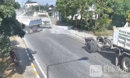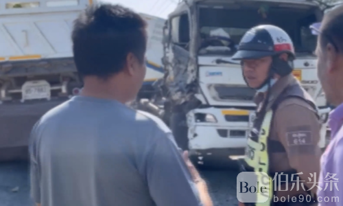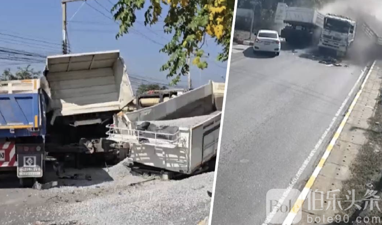 伯乐头条专讯:泰国素攀武里府乌通县23日上午发生一起惊魂交通事故,两辆大型拖挂货车在居民区道路猛烈相撞,其中一辆运输燃气的拖挂车发生气体泄漏,现场发出持续“嘶嘶”声,随时可能引发爆炸,附近居民被迫紧急疏散,整条道路一度陷入高度危险状态。