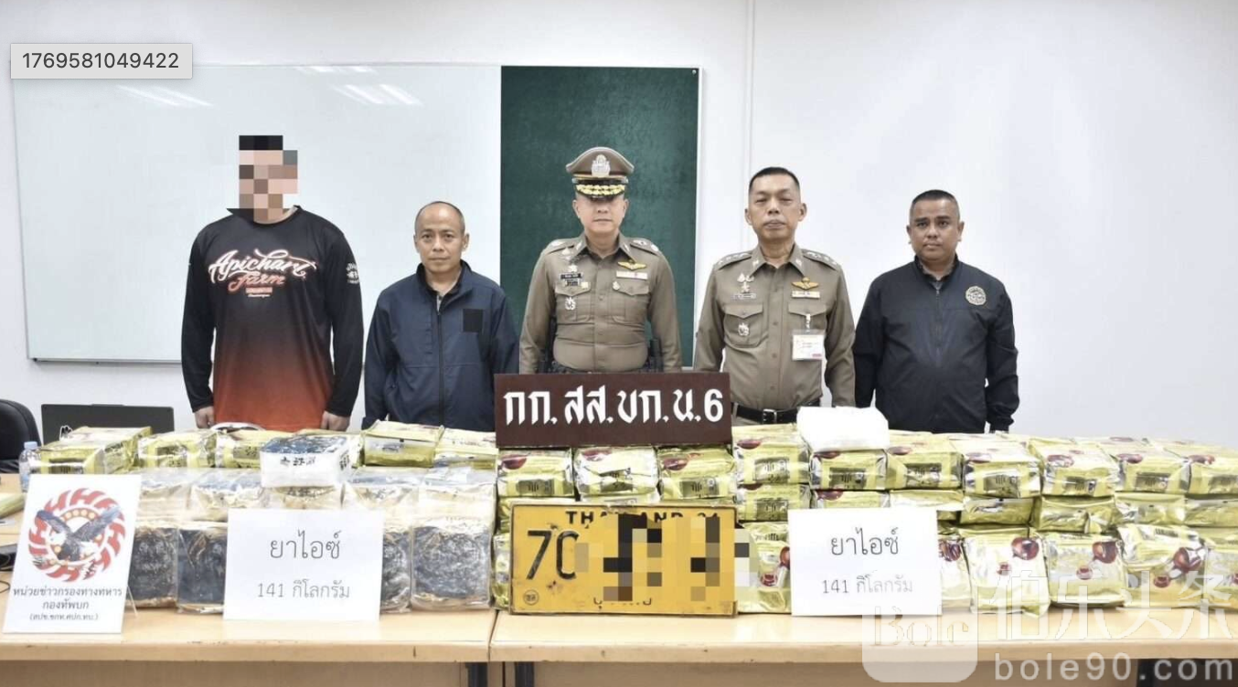 伯乐头条专讯:1月26日凌晨4时,泰国曼谷第六警区(BKK6)联合特别行动队在绕城高速公路成功截获一条大型冰毒运输链,缴获冰毒141公斤,逮捕两名嫌犯,另一人逃逸。