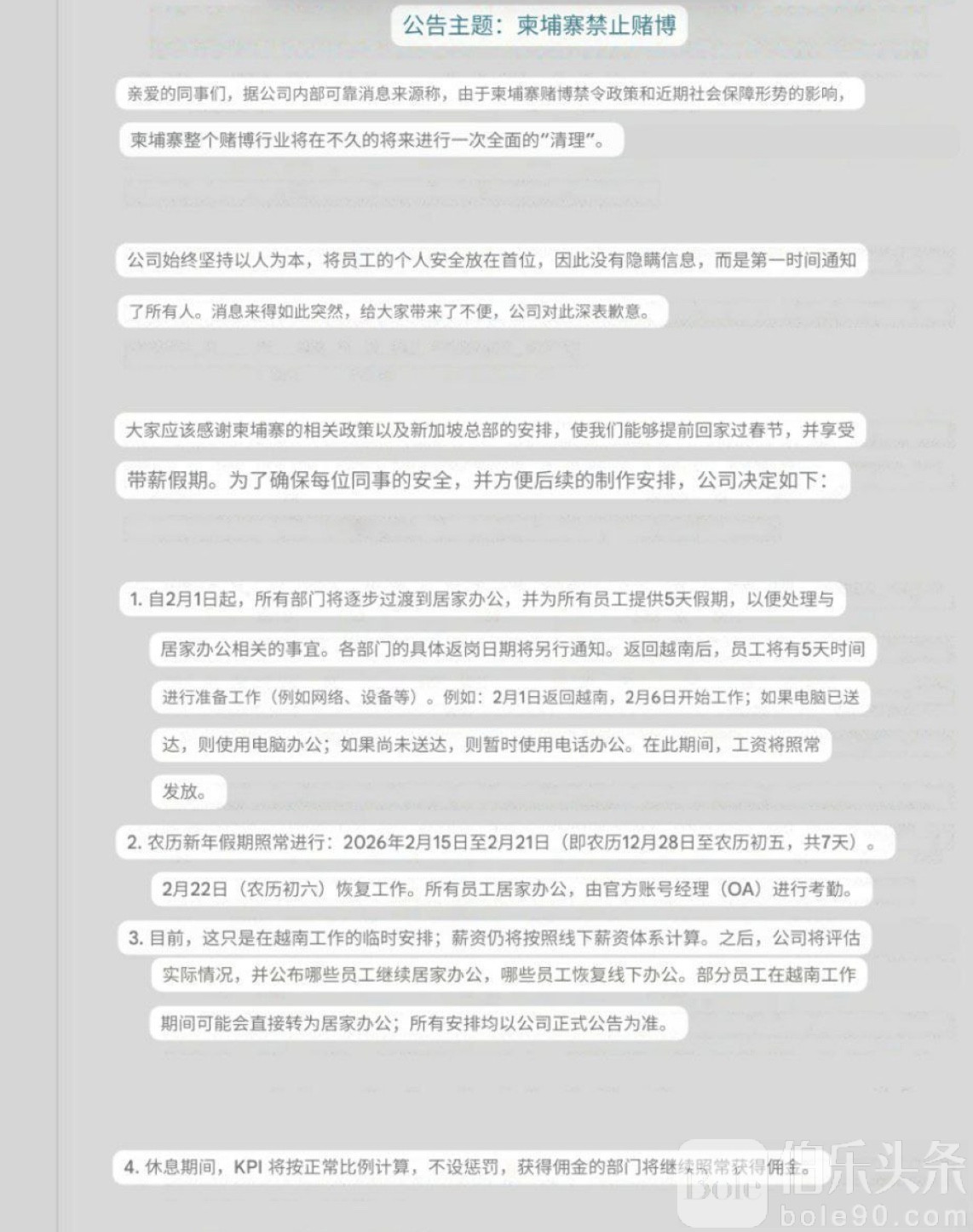 伯乐头条专讯:随着柬埔寨政府持续收紧对赌博及相关产业的监管力度,当地博彩行业或正站在一次重大洗牌的门槛上。近日,一则内部公告在业内流传,内容直指“柬埔寨禁止赌博”背景下,相关行业即将迎来一轮大规模清理,多家企业已提前启动应对方案。