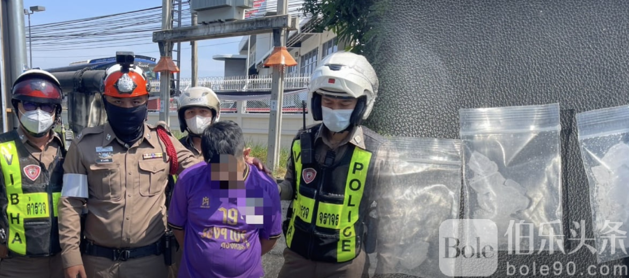 伯乐头条专讯:泰国曼谷维帕瓦迪—兰实快速路交通控制中心交警,日前在执行日常巡逻任务时,凭借机警判断拦下一辆严重违规的摩托车,意外揭发一起毒品案件。一名男子骑着未悬挂车牌、且未佩戴安全头盔的摩托车,载着女伴与年幼孩子在维帕瓦迪—兰实路并行道行驶,当场被发现身藏多袋冰毒。