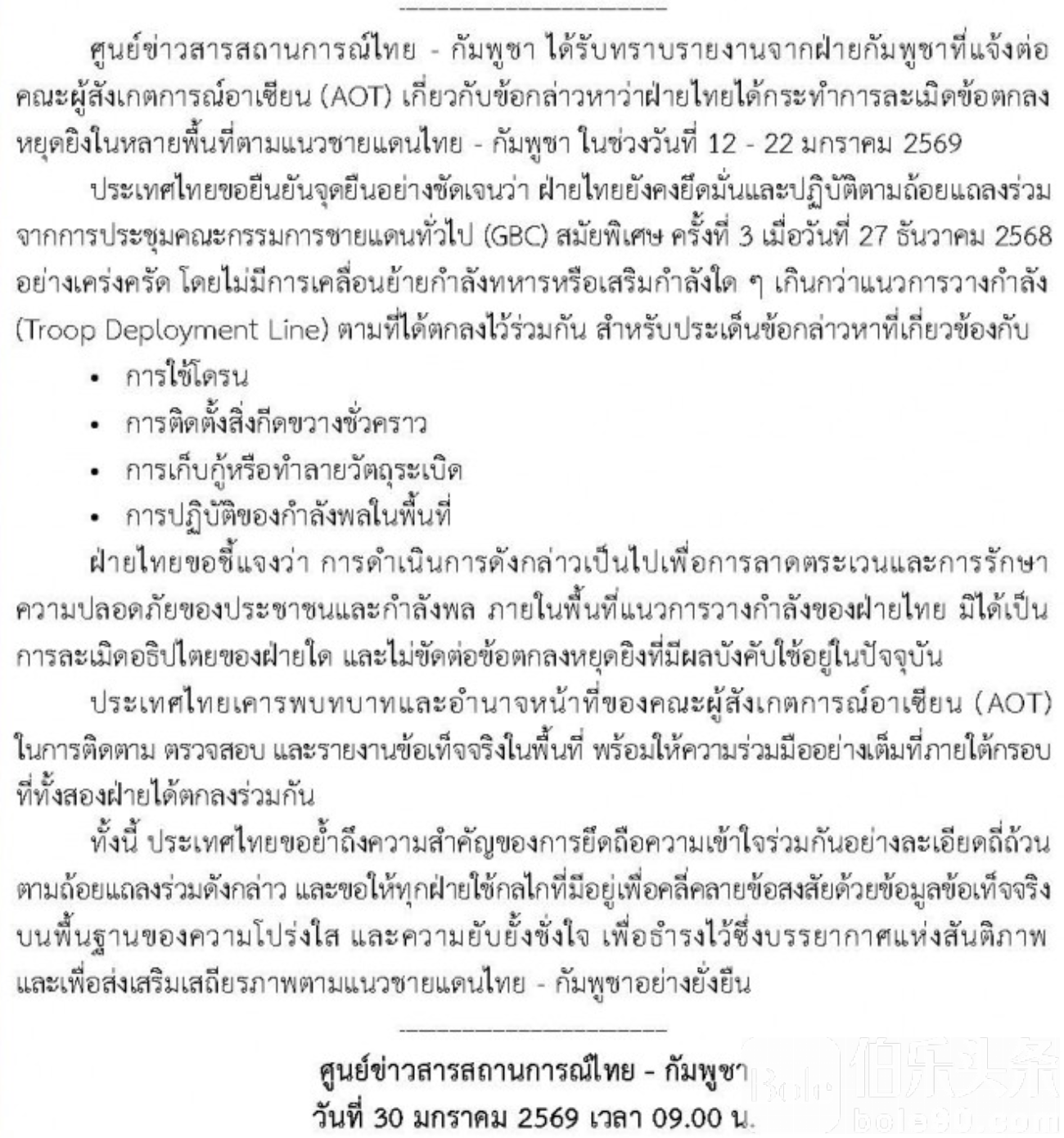 伯乐头条专讯:近日,针对柬埔寨方面向东盟观察团(ASEAN Observer Team, AOT)提出的“泰方违反停火协议”指控,泰国政府明确表示,该指控不属实,泰方在泰柬边境的所有行动均严格遵守双方先前签署的《联合声明》和《一般边界委员会》(GBC)特别会议第3次会议达成的安排。