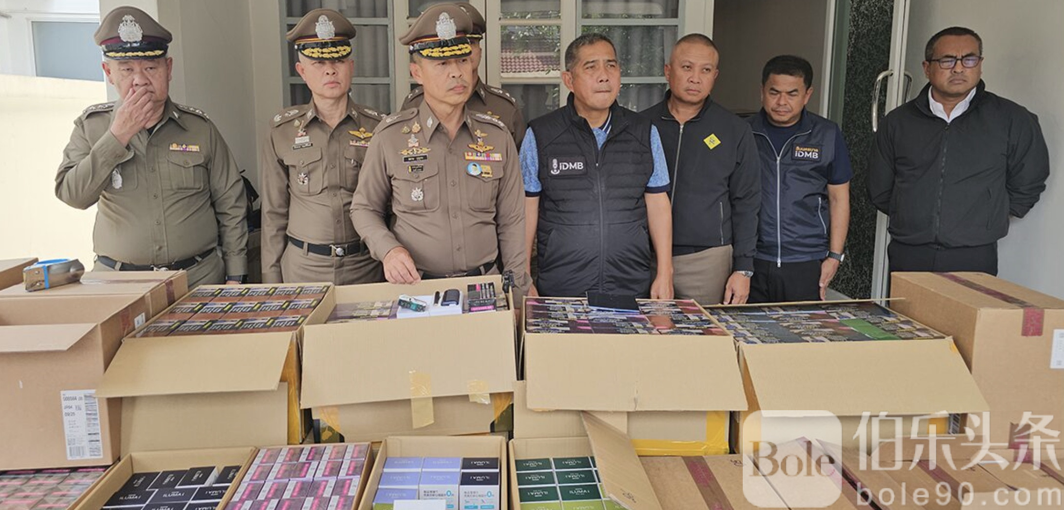 据警方介绍,此次行动由曼谷警察总部联合辖区分局以及税务部门展开,属于之前1月27日一次公寓电子烟案件的延伸调查。调查显示,其中一处位于Nawamin路74巷的独立住宅内,仓储着约500台电子烟机和约4300盒烟弹,总计约80万件,价值约1,000万泰铢;另一处位于Lat Krabang的独立住宅,则存放约200箱烟弹,总数超过10万件,价值约2,000万泰铢。