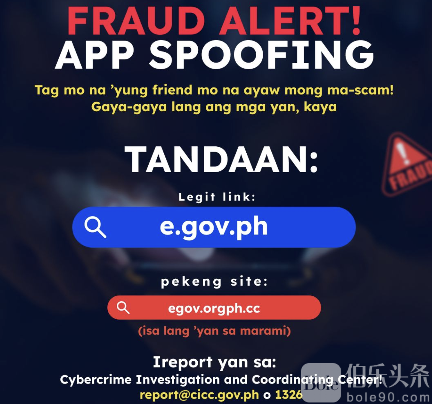 Bole新闻专讯:菲律宾当局近日警告民众,谨防冒牌eGovPH应用诈骗。诈骗分子会通过电话、电子邮件或聊天工具联系受害者,自称提供eGovPH注册或验证协助,并诱导下载假冒应用程序。
