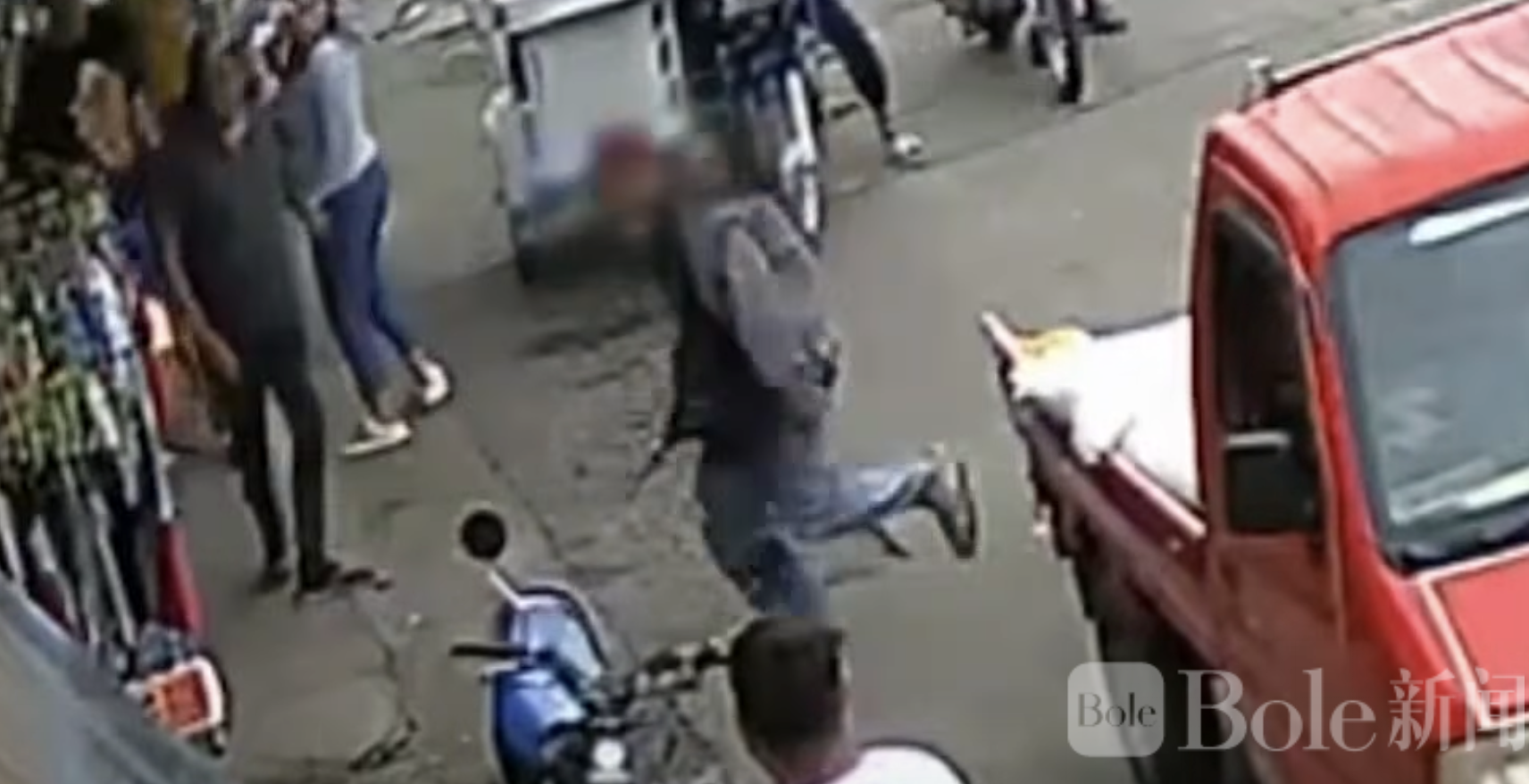画面还显示,被袭击的骑手并未就此离开,而是返回自己的摩托车取出一件物品,随后追入市场,反过来对先前袭击他的白衣男子挥刀反击,现场一度陷入混乱。