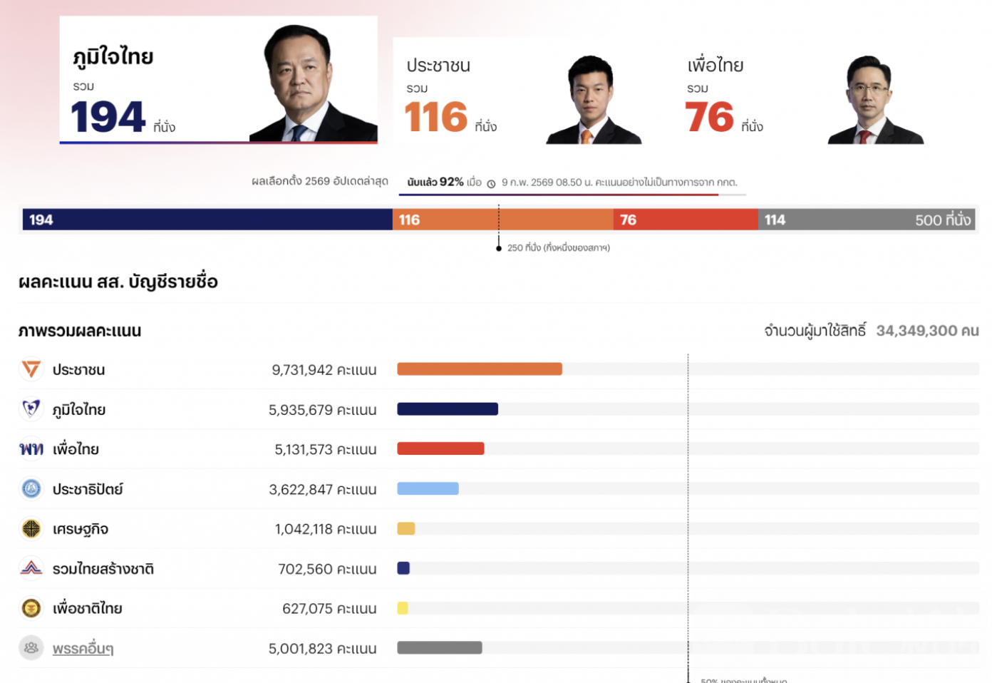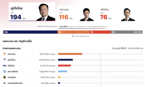 阿努廷表示,泰自豪党衷心感谢全国选民给予的每一张选票与支持。虽然目前尚未公布正式席位数,但根据各地回传的数据与持续追踪的计票结果,可以确认泰自豪党在本次选举中获得的众议院席位暂时排名第一。