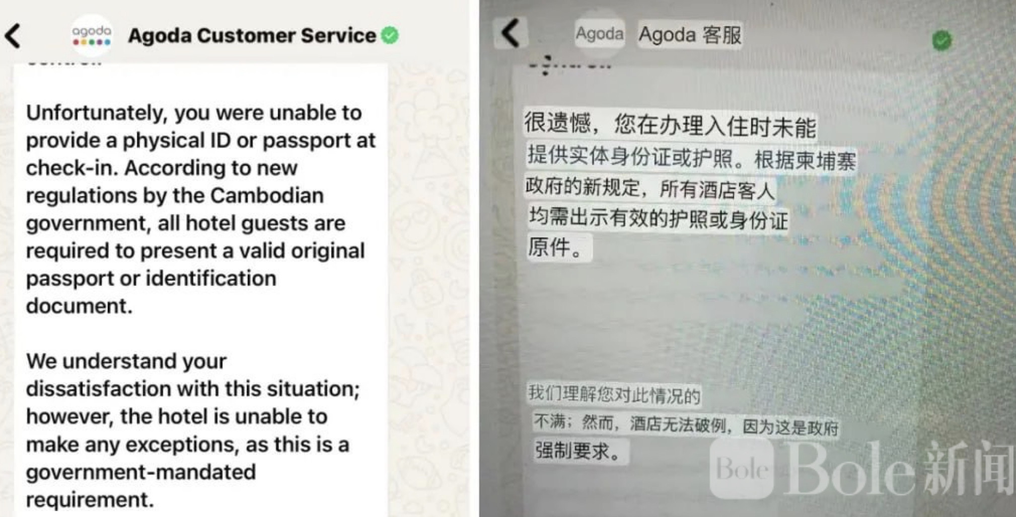 老李还向记者展示了与Agoda客服的沟通记录,客服表示:“根据柬埔寨政府的新规定,所有酒店客人必须出示有效护照或身份证原件,这是政府的强制要求。”