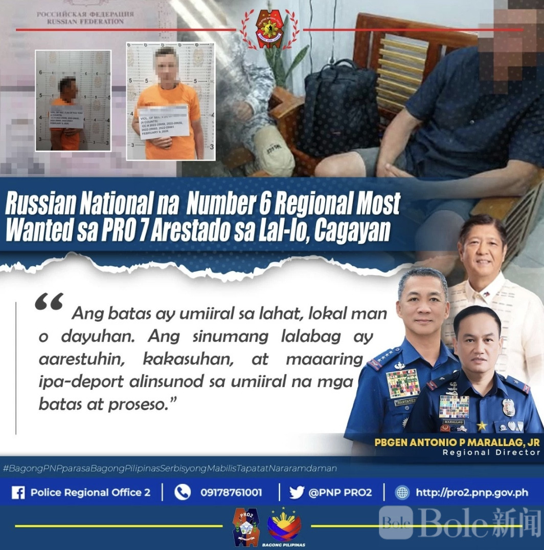 Bole新闻专讯:菲律宾卡加延市拉卢(Lal-lo)市Barangay Centro地区,于2月9日成功抓获一名长期通缉的俄罗斯嫌犯。被捕者为52岁、已婚、来自内格罗斯东方省瓦伦西亚的商人Andrew。