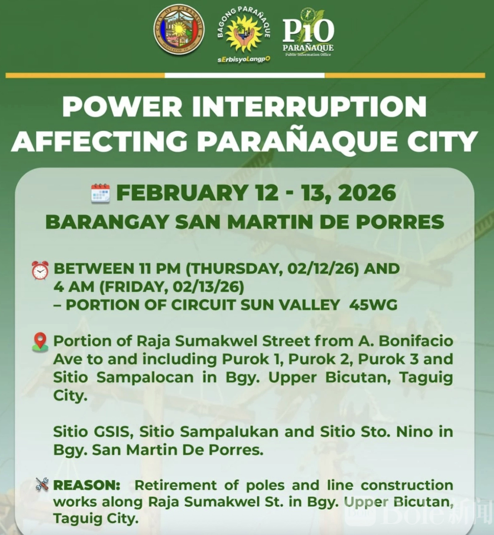 Bole新闻专讯:菲律宾马尼拉电力公司(Meralco)将于2月12日至13日实施计划性停电。帕拉尼亚克市政府提醒,位于圣马丁·德·波雷斯(San Martin de Porres)描笼涯的部分居民,需提前做好应对准备。