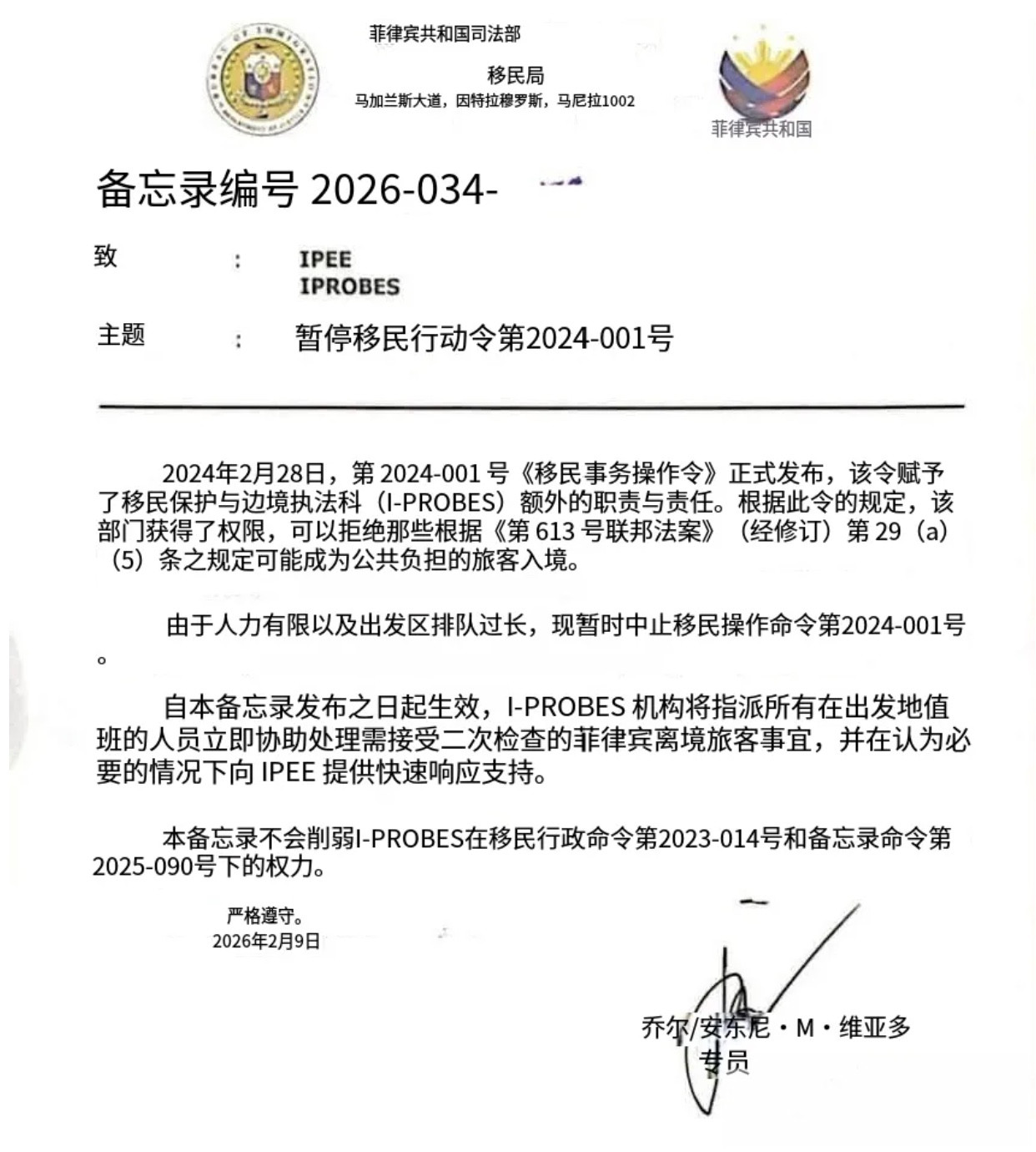 Bole新闻专讯:在菲的家人们,最近是不是被一条“利好消息”刷屏了?2026年2月9日,菲律宾移民局悄然发布最新备忘录,直接给让人谈之色变的入境审查,按下了暂停键!