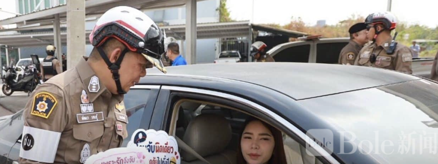 Bole新闻专讯:2026年2月14日情人节当天上午,泰国春武里府府治县东华洛地区出现温馨一幕,当地东华洛警署交警并未向违规司机开罚单,而是改送玫瑰花,用特别方式提醒民众遵守交通规则,现场气氛从紧张迅速转为惊喜与感动。