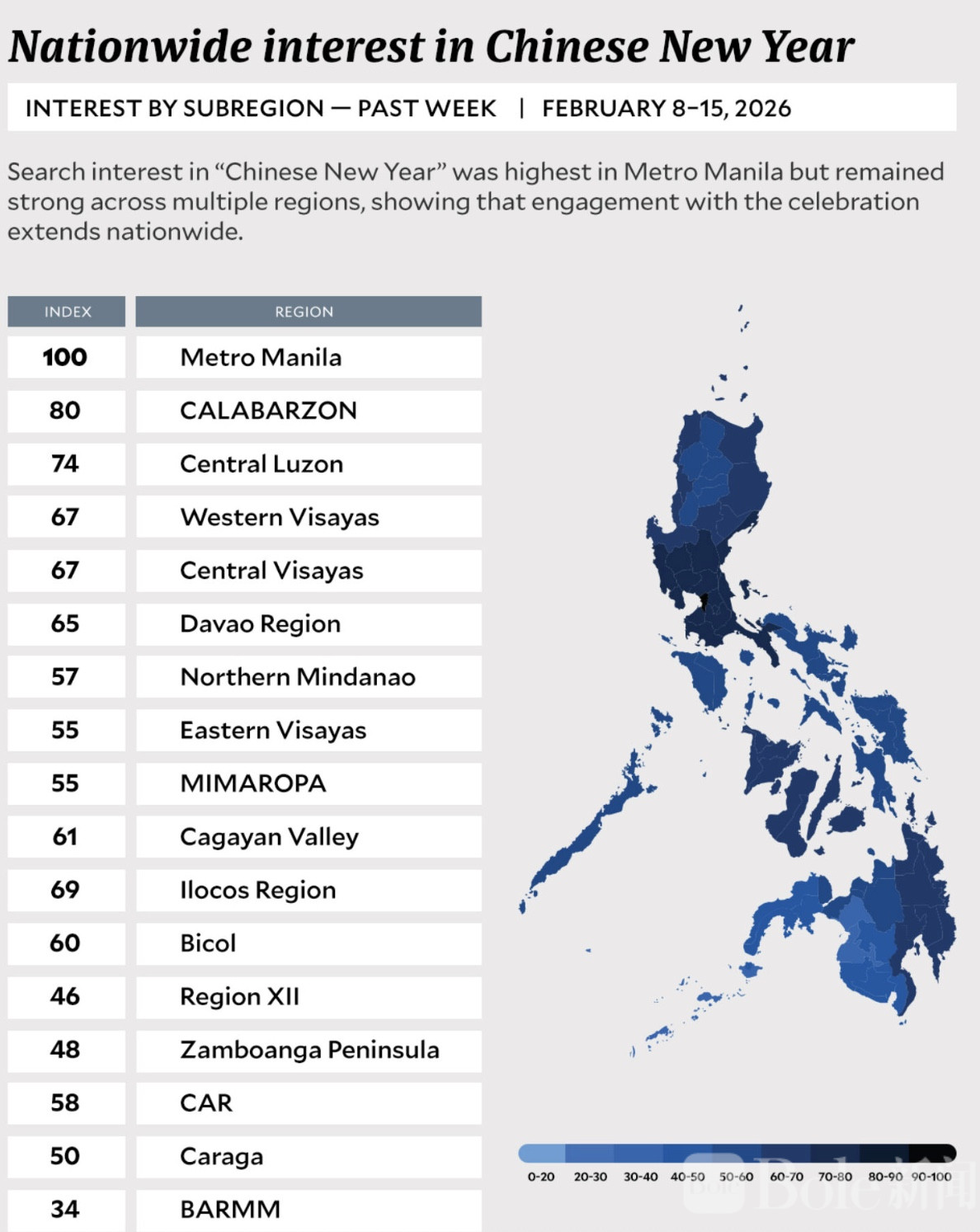 在春节来临的前几天,“岷伦洛”相关搜索迅速飙升,查询内容多半与实用信息相关:怎么去、哪里吃、哪里拜、哪些景点值得看。这也反映出,人们对春节的体验不仅是观赏,更是参与和感受。Metro Manila 的搜索指数达到 100,而卡拉巴松地区(Calabarzon)和中吕宋(Central Luzon)也分别达到了 35 和 26,显示兴趣虽集中于首都,但热情辐射至周边地区。