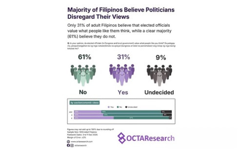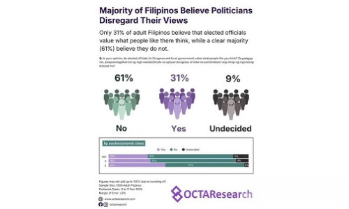 Bole新闻专讯:一项最新民调结果为菲律宾政坛投下耐人寻味的一笔。根据独立民调机构Octa Research日前公布的调查数据,多数菲律宾成年人认为,自己在政治决策中的声音并未真正被重视。换句话说,在不少民众眼中,选出来的官员,似乎离“倾听者”的角色还有一段距离。