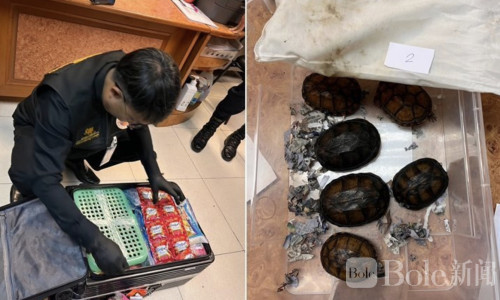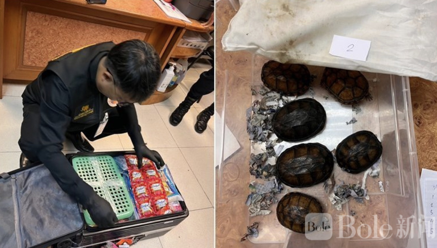 Bole新闻专讯:泰国素万那普机场深夜展开联合执法行动,一名印度籍男子因涉嫌将多只珍稀野生动物藏匿于行李箱内,企图偷运出境,被当场拘捕。执法人员从其行李中查获活体野生动物共15只,包括1只长尾叶猴、1只长臂猿及13只珍稀龟类。