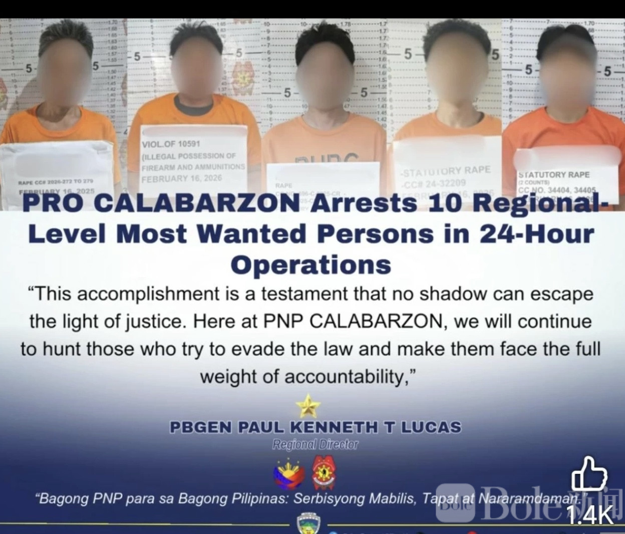 据警方通报,行动于2月16日至17日在Cavite、Batangas、Rizal、Laguna和Quezon等地同步展开。警方第四区(PRO 4-A)负责人保罗·肯尼思·卢卡斯准将指出:“没有任何阴影能逃脱正义的光。”他强调,当局将继续依法展开积极行动,让试图逃避法律的人承担应有的后果。