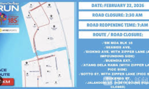 Bole新闻专讯:2月20日,为配合即将举行的马尼拉周日马拉松赛事,马尼拉警方发布交通公告,宣布自21日晚11点起,多条市区主要道路将暂时封闭,直至赛事结束。此次封闭涉及罗哈斯大道(Roxas Boulevard)南北双向路段、文尼法寿大道(Bonifacio Drive)、P·武敖斯大道(P. Burgos Avenue)及金融路(Finance Road)等关键通道,同时包括玛丽亚·奥罗萨街、王城内的穆拉亚街与圣露西亚街,以及A·索连诺大道、麦哲伦道(Magallanes Drive)、TM·加佬大道及基仁诺大街(Quirino Avenue)等多条道路。