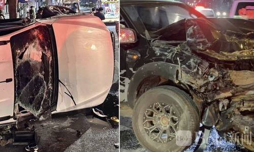 事故发生于凌晨2点左右,地点位于普吉龙市拉梅寺路的四岔路口,当地警方与救护人员迅速赶到现场。现场显示,两辆皮卡在红白闪灯的路口发生猛烈碰撞,其中一辆车辆翻覆,现场一片狼藉。救援人员立即将伤者送往普吉龙医院救治。