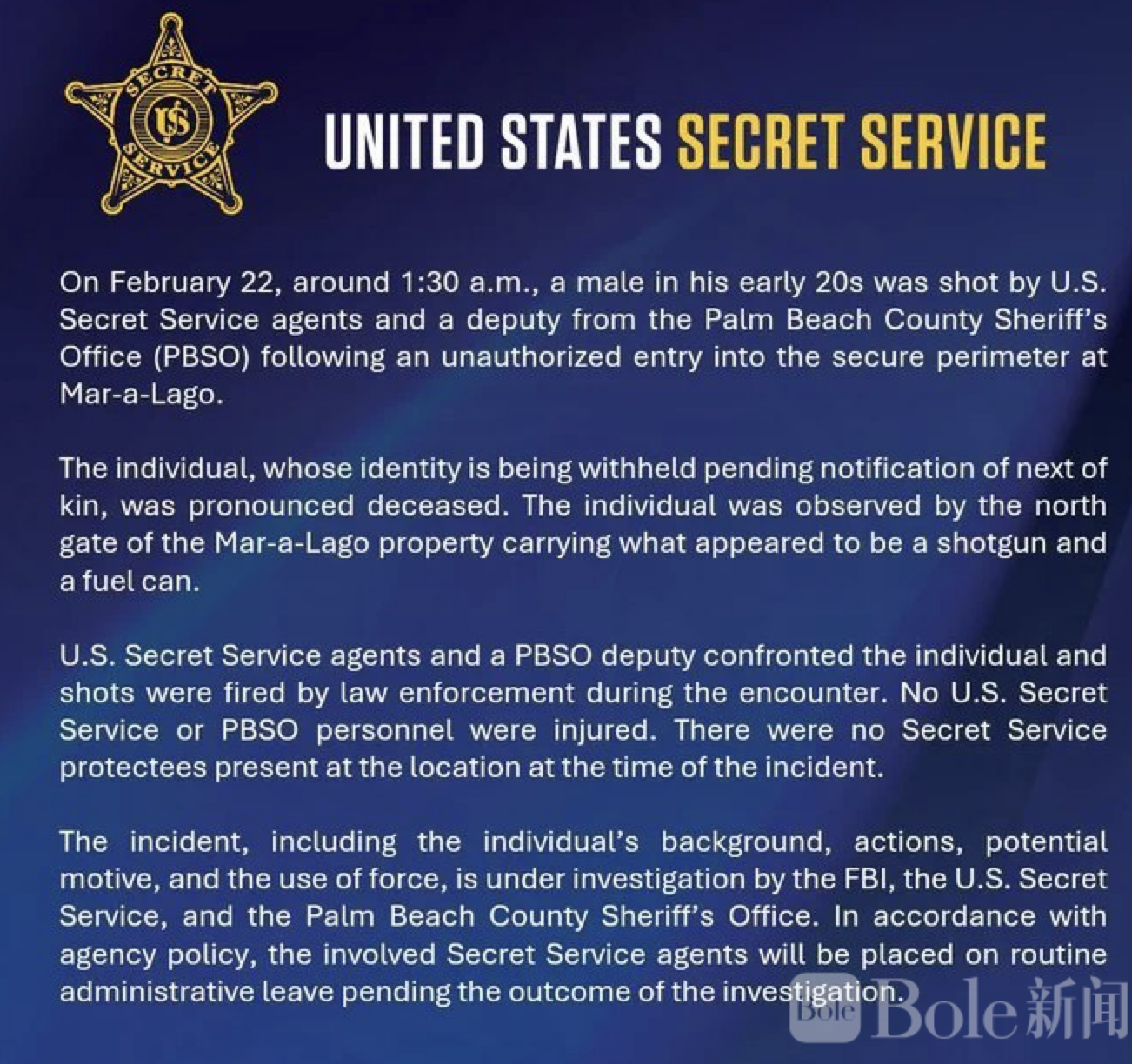 Bole新闻专讯:当地时间2月22日凌晨1时30分许,一名男子携带汽油罐和猎枪非法闯入位于佛罗里达州的特朗普私人住所海湖庄园(Mar-a-Lago)周界,被执法人员当场击毙。棕榈滩县警长Ric Bradshaw表示,该男子在对峙中向特工举起猎枪,执法人员随即开枪击中。事发时,特朗普本人在华盛顿。