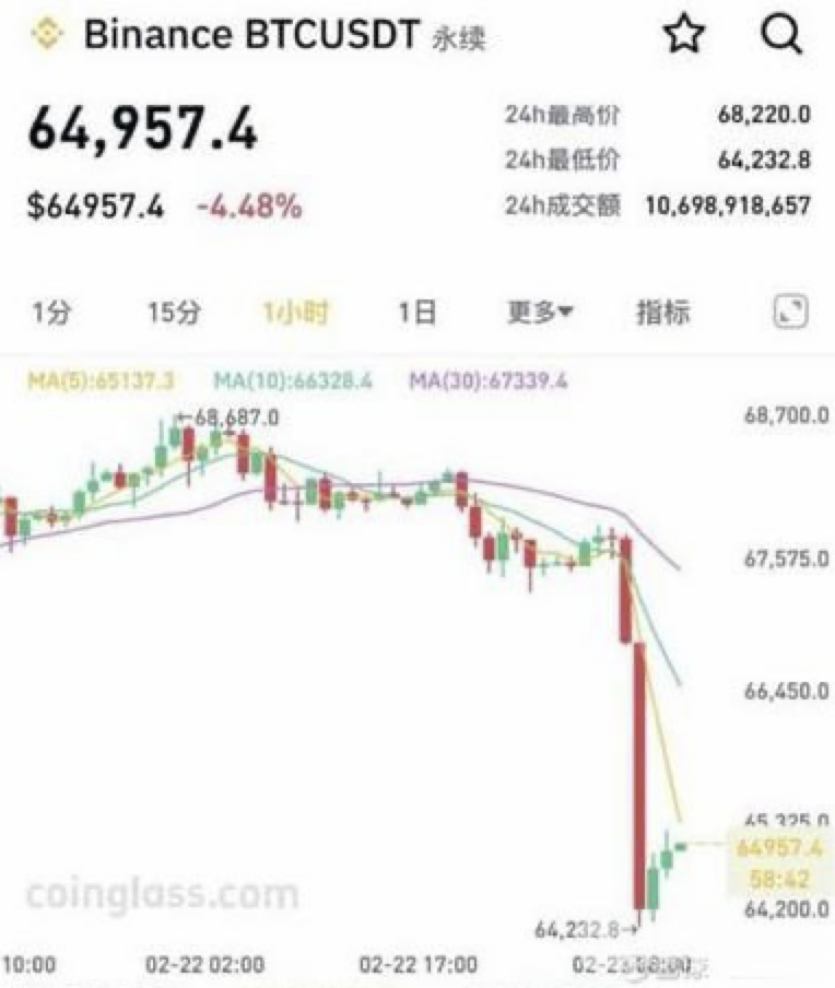 Bole新闻专讯:2月23日,比特币价格出现剧烈下跌,最低触及64232.8美元/枚,盘中一度跌破65000美元关口。截至北京时间11:55,比特币报64957.4美元/枚,下跌幅度超过4.4%。受此影响,加密货币市场整体下挫,多只主流数字资产跌幅超过5%。