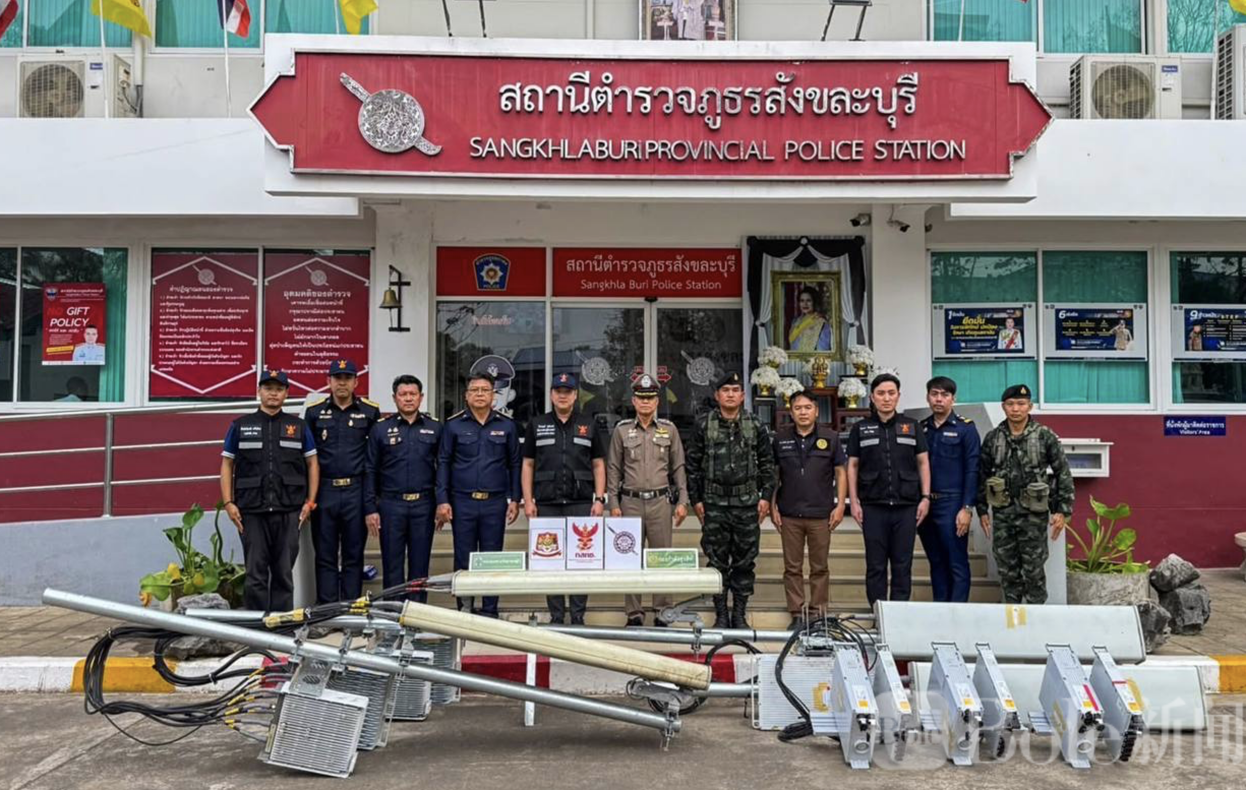 Bole新闻专讯:泰国北碧府桑卡拉武里县近日进行了一次重要的联合执法行动,泰国军方联合国家广播电视和通信委员会(NBTC)对多座非法通信设备进行搜查并予以扣押。这些设备被发现非法盗用线路,将信号指向缅甸三佛塔方向,涉嫌扰乱跨境通信秩序,违反泰国相关法律法规。