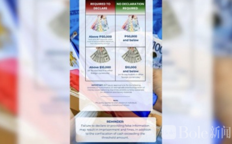 Bole新闻专讯:菲律宾海关局(BOC)周六再次提醒国内外旅客,入境或出境时携带菲律宾比索及外币需遵守现行申报规定。根据现行政策,旅客可携带外币现金及等值旅行资金,但若总额超过1万美元或其他外币等值金额,则必须在抵达或离境时向海关如实申报。申报可通过e-Travel系统提前完成,也可在机场和港口的指定BOC柜台办理。