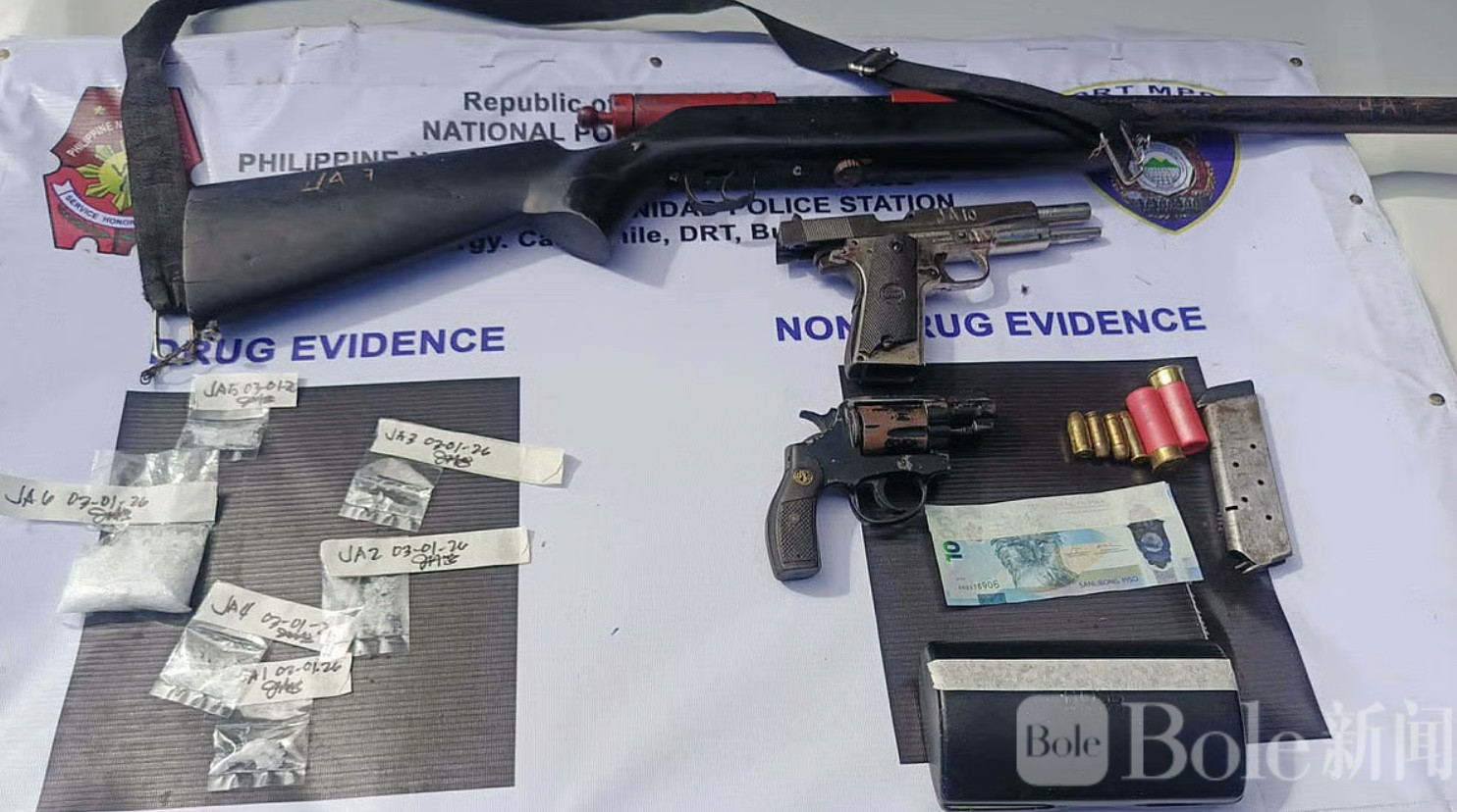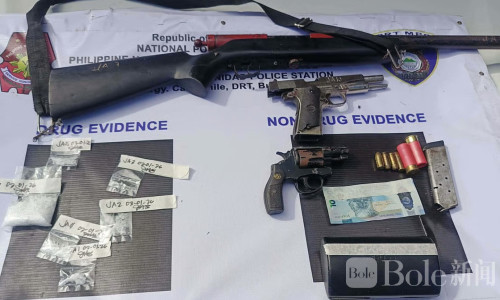 据当地Doña Remedios Trinidad市警局(DRT MPS)通报,此次行动由警局缉毒小组主导,并联合San Miguel警局、301区机动部队第三营、布拉干省PDEA第三区以及省情报部门共同执行。行动现场缴获50克疑似冰毒(市值约34万比索)、作案用标记现金及玻璃袋,一支自制霰弹枪及两发子弹、一支.45口径手枪两发子弹、一支.38口径手枪两发子弹,以及一辆三菱Strada皮卡和一辆Rusi摩托车。