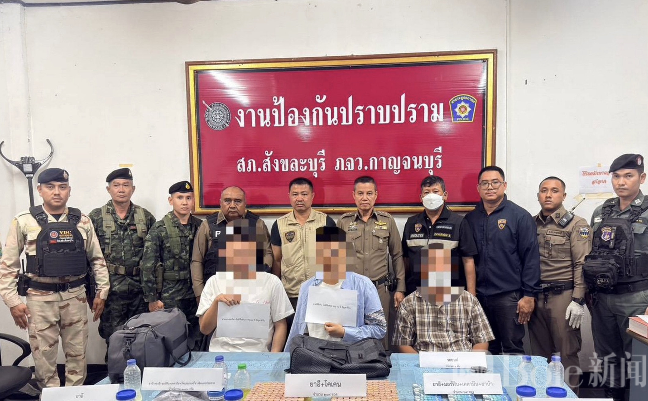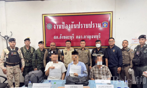Bole新闻专讯:泰国安全部门近日在西部边境展开联合行动,一条疑似横跨中国、柬埔寨、泰国与缅甸的贩毒链条被当场拦截。执法人员现场缴获多种毒品,估值超过300万泰铢,3名涉案人员被捕,其中包括两名中国籍男子。