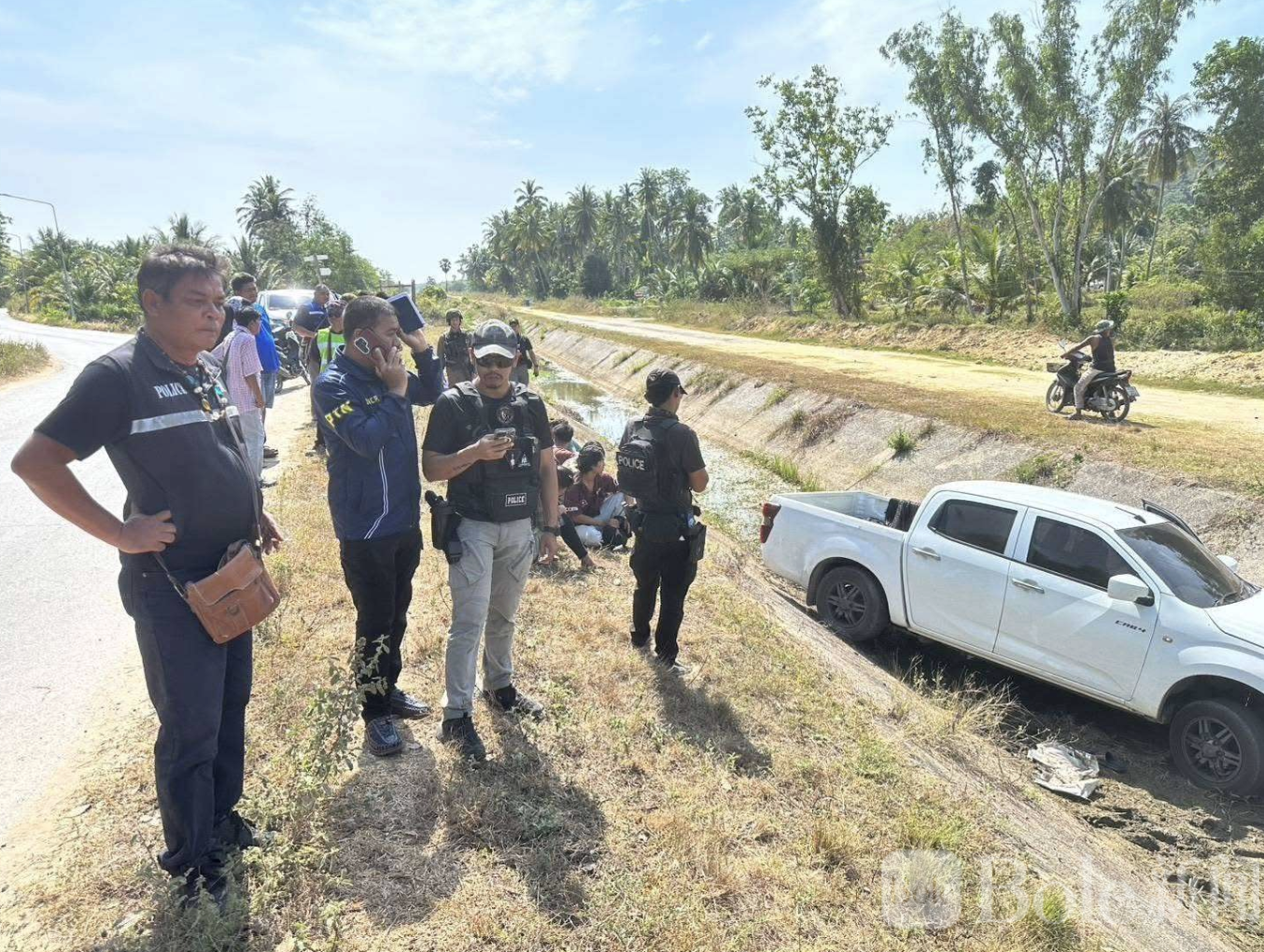 Bole新闻专讯:2026年3月5日,泰国帕塔尼府农吉区(หนองจิก)发生一起涉及非法劳工的交通事故。一辆白色伊苏兹四门皮卡在水利路边翻车,车上共载有多名缅甸籍非法劳工。事故发生后,五名劳工立即被发现,而驾驶员趁混乱逃逸,引发警方紧急追捕。