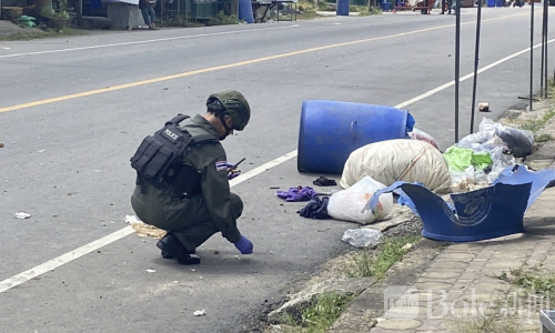 Bole新闻专讯:泰国南部纳拉提瓦斯府斯里萨功县日前发生一起爆炸事件,两名身份不明的嫌疑人骑摩托车到一家动物饲料店门前,将疑似装有炸弹的袋子丢进垃圾桶后迅速离开,随后现场发生爆炸。所幸事件没有造成人员伤亡,但爆炸威力巨大,店铺铁门被炸出密密麻麻的孔洞,碎片散落满地,现场一片狼藉。