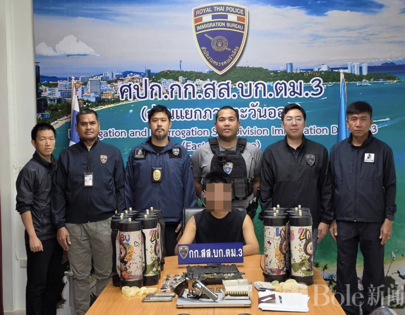 Bole新闻专讯:泰国移民警察第三分局日前在春武里府芭堤雅市展开代号“剪翼超级气球”的突击行动,成功捣毁一处隐藏在民宅中的非法贩卖点,并逮捕一名中国籍男子。警方在现场查获大量“笑气”、毒品及枪支弹药,案件目前正进一步调查扩展。