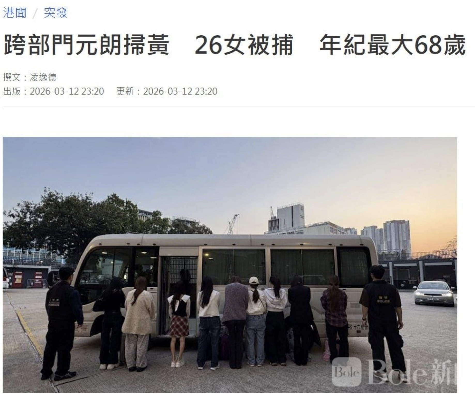 Bole新闻专讯:香港元朗警方与入境事务处联合展开代号“火石”的扫黄行动,周四(3月12日)在区内多个地点同步出击,成功拘捕26名中国大陆女子,年龄跨度从19岁至68岁不等。被捕人员均涉嫌“违反逗留条件”,目前正被扣留调查。
