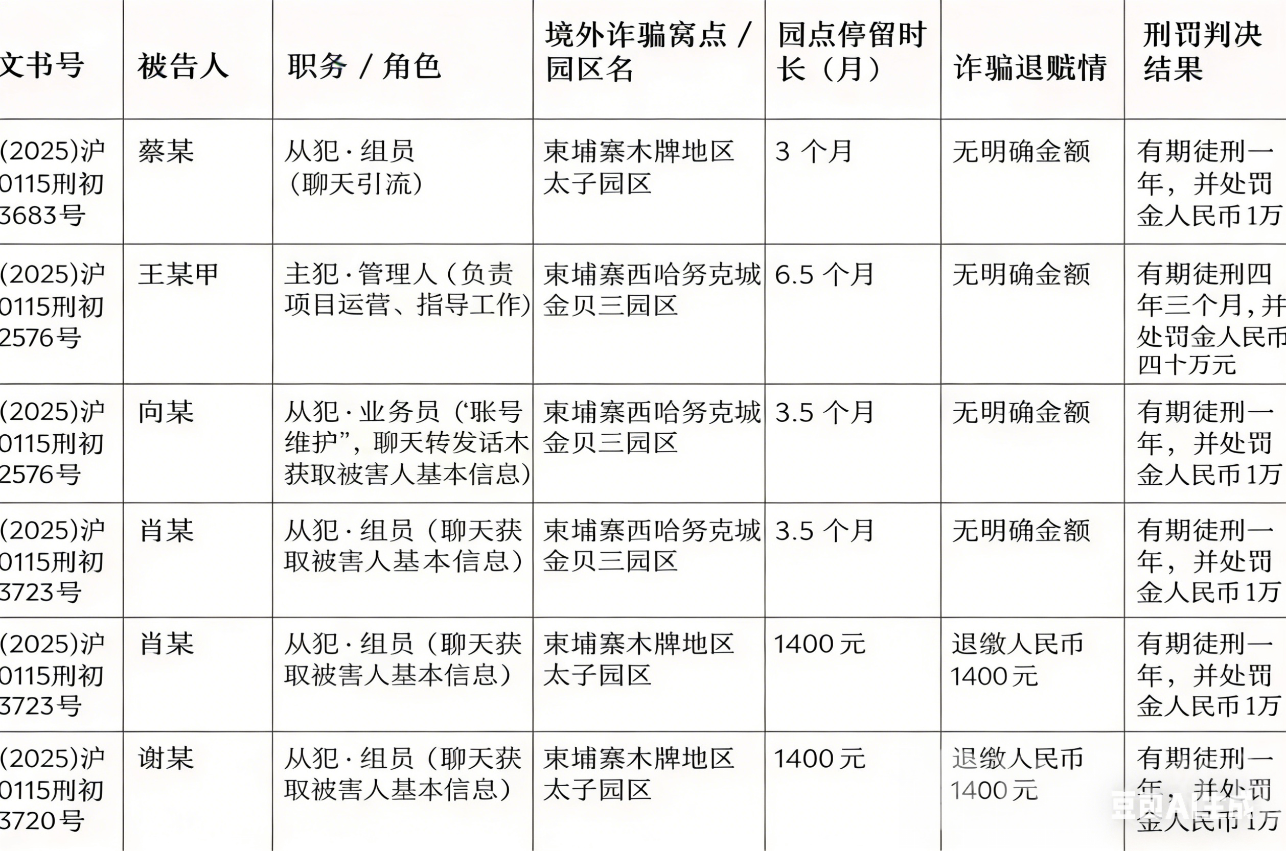 真实判例显示,不同岗位的人员均难逃法律制裁:蔡某在柬埔寨“太子园区”工作3个月,负责聊天引流,被判有期徒刑2年并罚款2万元;肖某、谢某在同一园区工作4个月,负责信息套取,两人各退赃1400元,均判2年、罚款2万元;向某在西港金贝三园区从事账号维护、技术支持,工作3个半月,没有退赃,同样判刑2年并罚款2万元;而王某甲作为管理人员,停留6个半月,负责项目运营和指导,家属退缴6万元,他则被判有期徒刑4年3个月并罚款4.5万元。