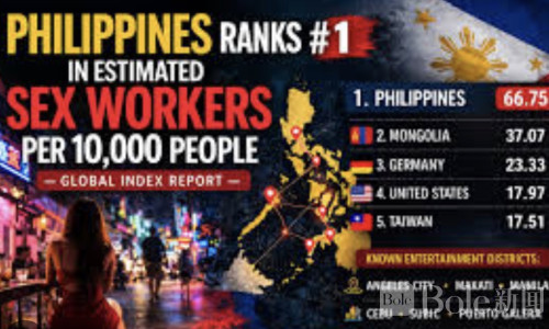 Bole新闻专讯:一项国际数据报告显示,菲律宾在全球性工作者比例中居首位。根据 Alpha Index 引用的全球数据集估算,每1万人中约有66.75名性工作者,远高于第二名蒙古的37.07人。这份排名同时显示,德国、美国和台湾分别位列第三至第五。