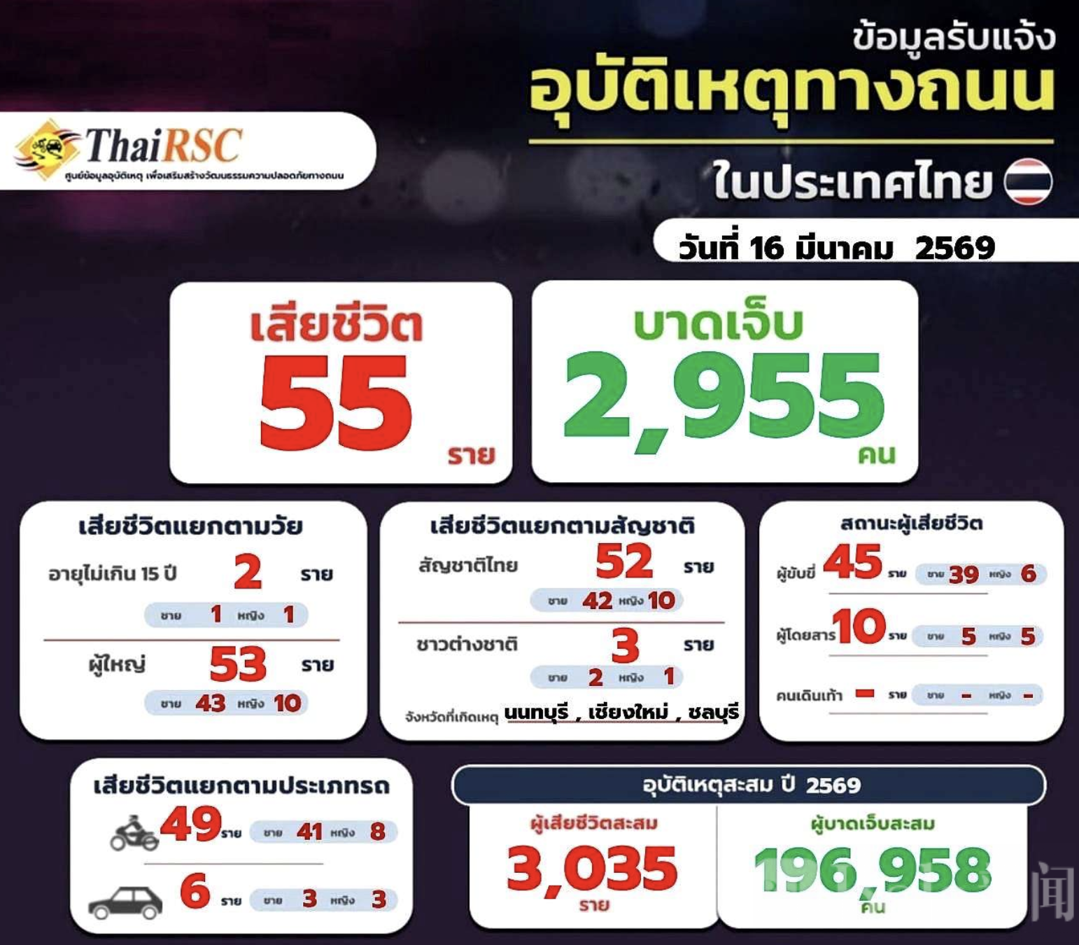 Bole新闻专讯:泰国道路安全状况再敲警钟。据泰国路面交通事故数据中心(ThaiRSC)统计,2026年3月16日,全国范围内发生严重交通事故,共造成55人死亡,受伤人数高达2,955人,反映出道路安全问题依然严峻。