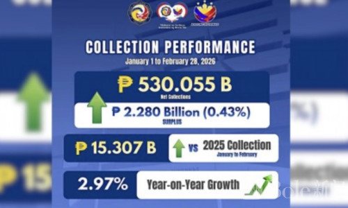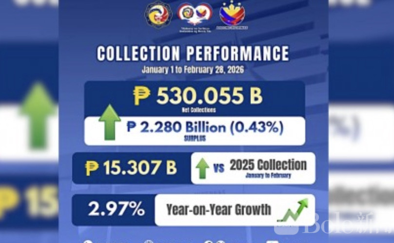 Bole新闻专讯:菲律宾税务局(BIR)最新披露的数据显示,2026年前两个月全国税收表现“有点超预期”——不仅完成目标,还略微多收了一点。统计显示,截至2月28日,税务局净征收总额达到5300.55亿比索,超过原定5277.75亿比索的内部目标,多出约22.8亿比索,完成率达100.43%。