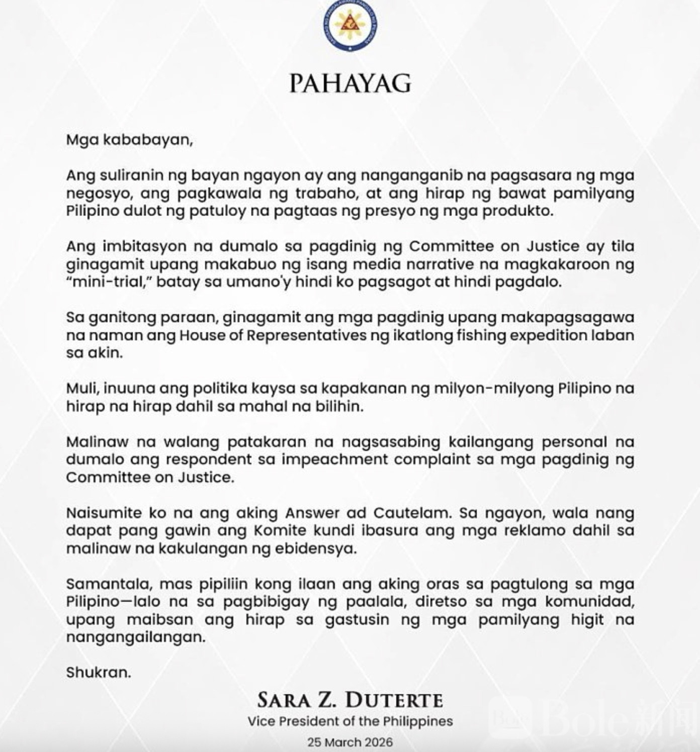 Bole新闻专讯:在物价持续上涨、民生压力不断累积的背景下,菲律宾副总统萨拉·杜特尔特于3月25日公开发声,将矛头直指部分政客的“政治操作”,直言当前最紧要的不是表演式听证,而是解决老百姓的现实困境。