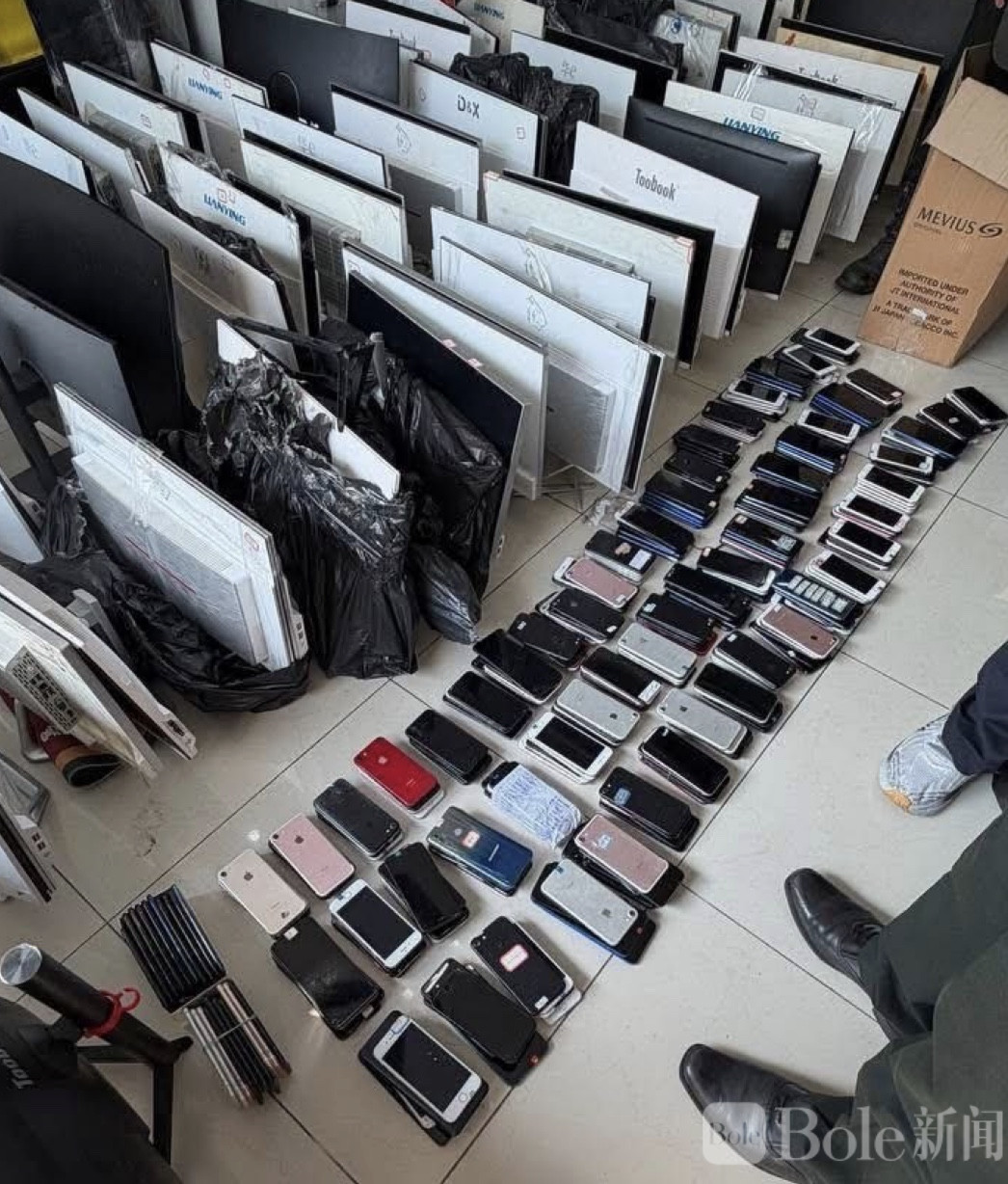 Bole新闻专讯:3月26日,柬埔寨西哈努克省,省行政联合部队对位于西港的疑似网络诈骗场所“金玉满堂”赌场展开突击检查。此次行动中,执法人员查获了大量可疑物品,包括133台电脑、439部手机以及5支气枪,并成功抓获9名涉案嫌疑人。