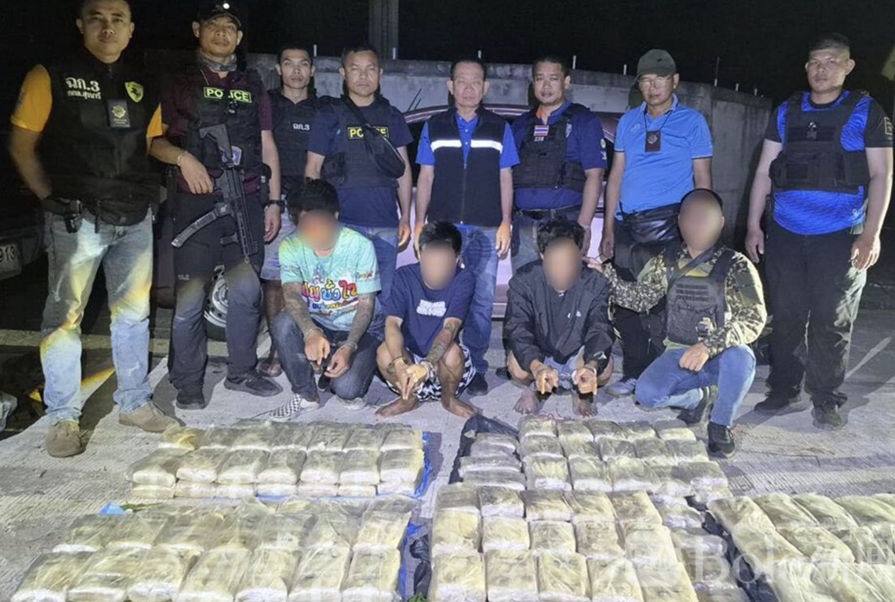 说起来,警方盯上这个团伙也有一段时间了。早在3月29日晚上11点左右,侦查小组就已经摸清了这个团伙的可疑行踪,随后在四色菊府乌冬普披塞县兰朗村4041号乡村公路旁,成功将其抓获。之后,警方又顺藤摸瓜,扩大搜查范围,前往拉西赛县农恩村的目标区域进行排查,没想到还真找到了他们藏毒的窝点。