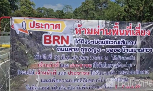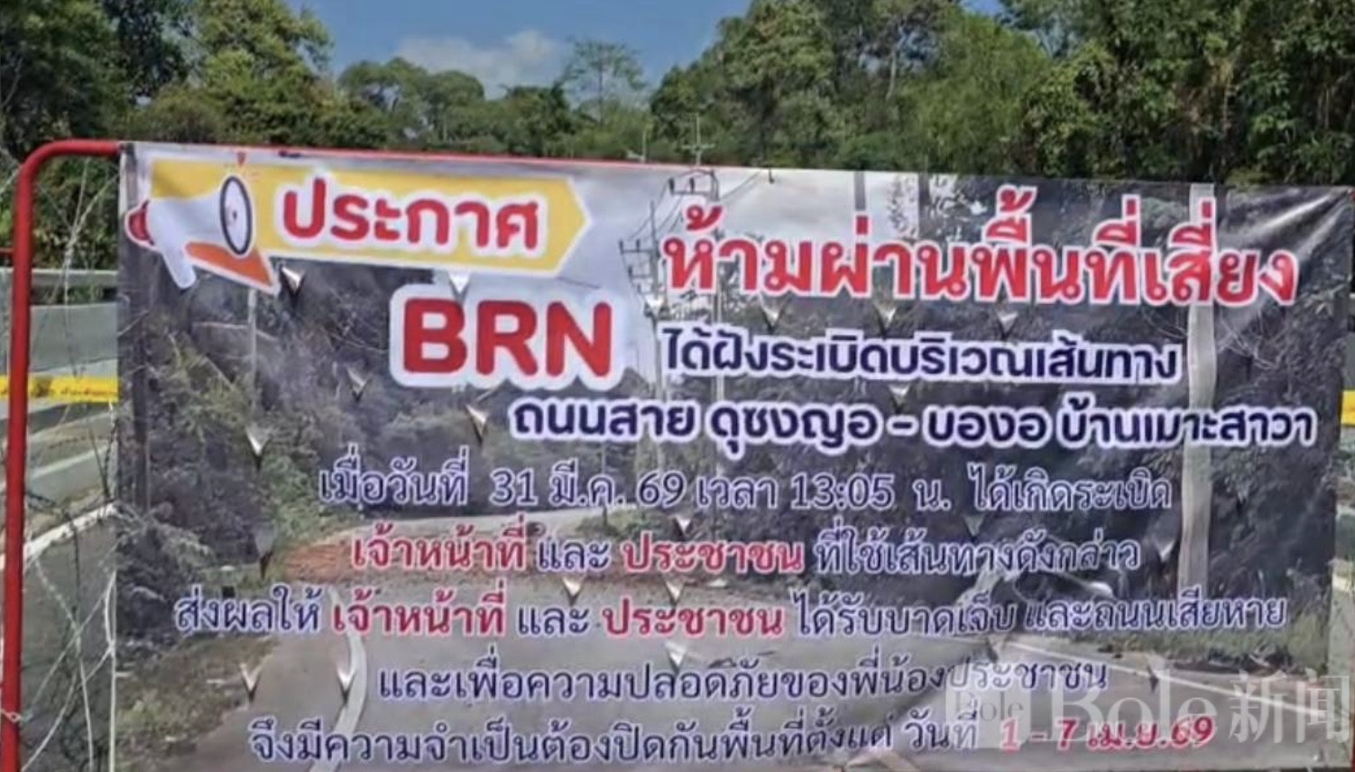 Bole新闻专讯:泰国南部那拉提瓦府最新消息,当地“杜松牙-邦奥”路段因排雷与安全检查,将从4月1日起封闭7天。此前,该路段曾遭BRN组织安放炸弹袭击,造成警方5人和两名平民受伤,同时路面严重受损。为确保安全,当局在路口架设铁栅栏和铁制阻隔物,并挂上大幅警示牌,明确标示“危险区域禁止通行”,以便排雷小组(EOD)及相关部门彻底清理潜在爆炸物,避免再次发生意外。