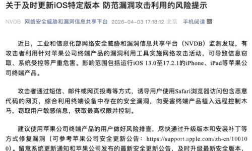 Bole新闻专讯:中国工业和信息化部网络安全威胁和漏洞信息共享平台(NVDB)近日发布重要提醒,发现有攻击者利用针对苹果终端设备的漏洞工具实施网络攻击,可能导致信息被窃取、系统受控等严重后果。