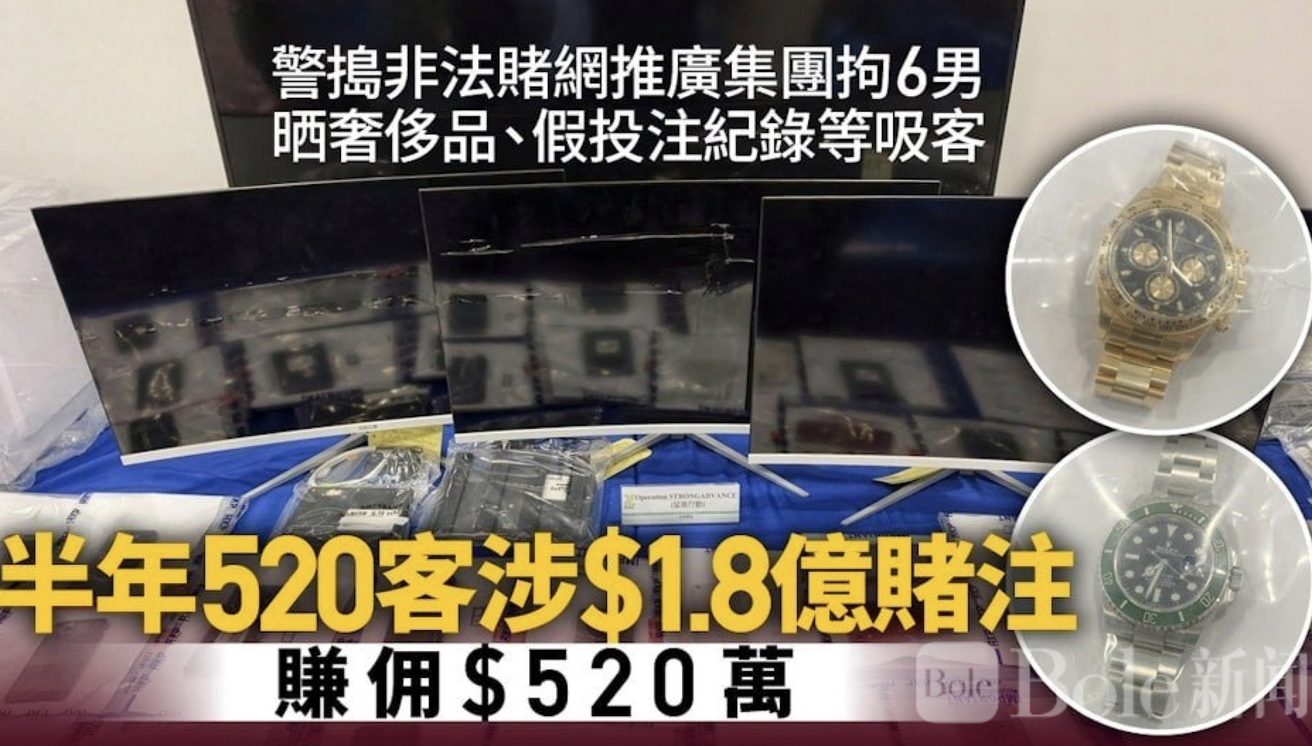 Bole新闻专讯:香港警方日前展开代号“猛进”的专项行动,在长沙湾一处工业大厦内捣毁一个由黑社会操控的网上非法赌博推广营运中心,并拘捕6名男子,涉嫌“推广或便利收受赌注”等罪名。