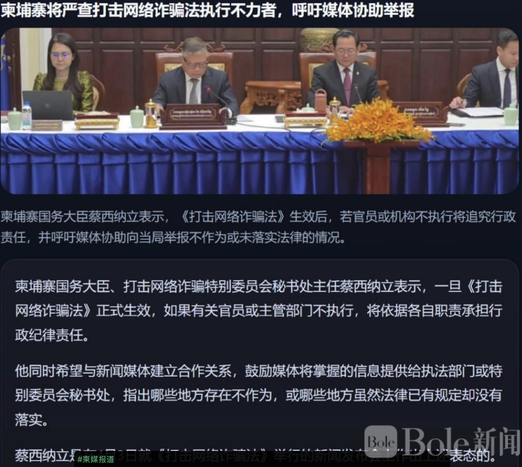 Bole新闻专讯:柬埔寨政府近日释放强烈信号,随着《打击网络诈骗法》即将正式生效,凡在执行过程中存在不作为或落实不力的官员与相关机构,将被依法追究行政责任,全面强化电诈治理力度。