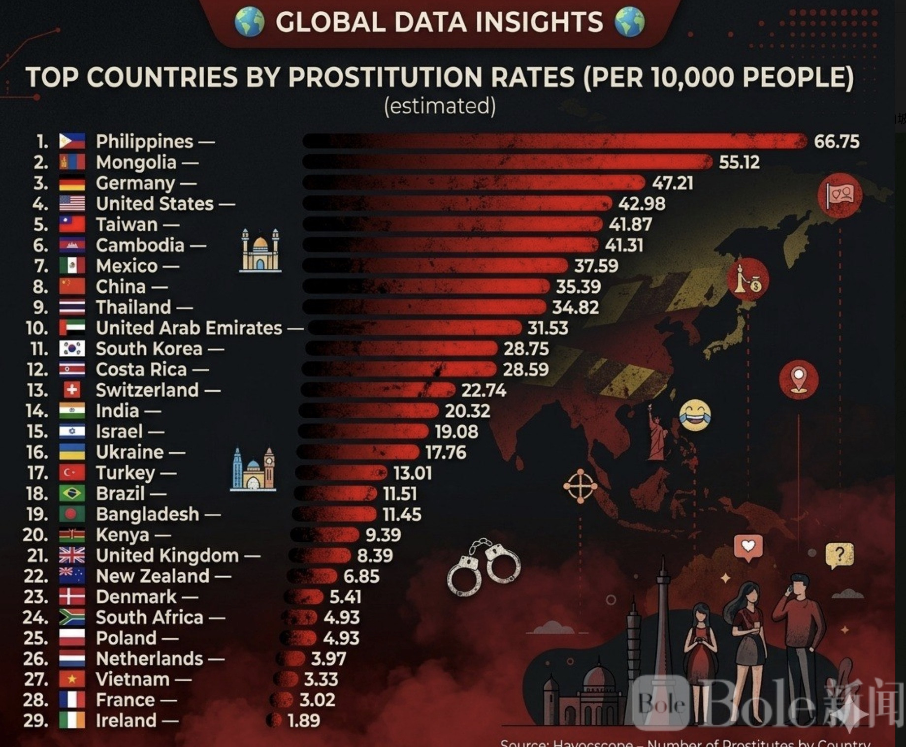 Bole新闻专讯:一份关于全球卖淫行业规模的统计数据近日在网络上引发讨论。根据市场研究机构 Havocscope 的统计资料,从各国卖淫从业人数与人口比例综合计算,菲律宾在相关排名中位居第一,指数达到66.75,在榜单中显得格外醒目。