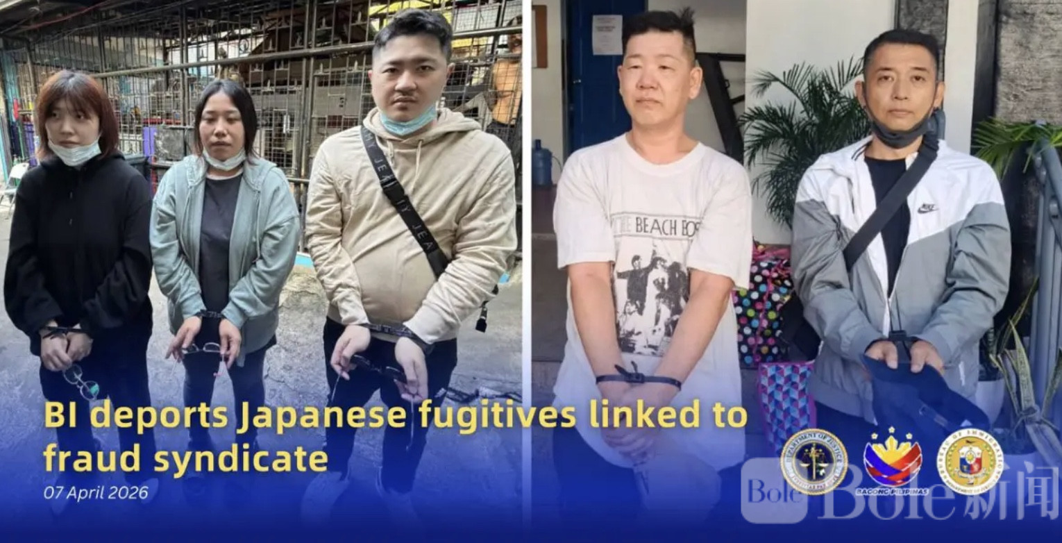 Bole新闻专讯:菲律宾移民局(BI)4月7日将5名涉嫌参与跨国诈骗活动的日本籍逃犯押送出境,遣返回日本东京。这一行动被视为菲律宾政府近期加强打击跨国犯罪、清理境内外国逃犯的重要举措之一,也再次释放出一个信号——菲律宾不会成为犯罪分子的“避风港”。