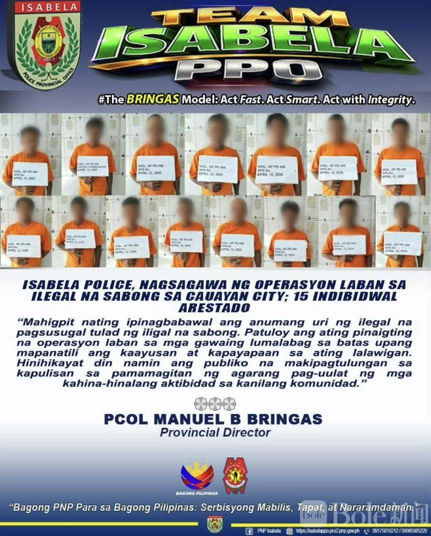 Bole新闻专讯:4月12日周日,菲律宾伊莎贝拉省卡瓦延市警方展开突袭行动,在迪亚瑙社区一举抓获15名涉嫌参与非法斗鸡的人员,当场搜出斗鸡、赌资及相关工具,狠狠打击了当地的非法赌博歪风,不过还有2名关键涉案人员侥幸逃脱,目前警方正在全力追捕。