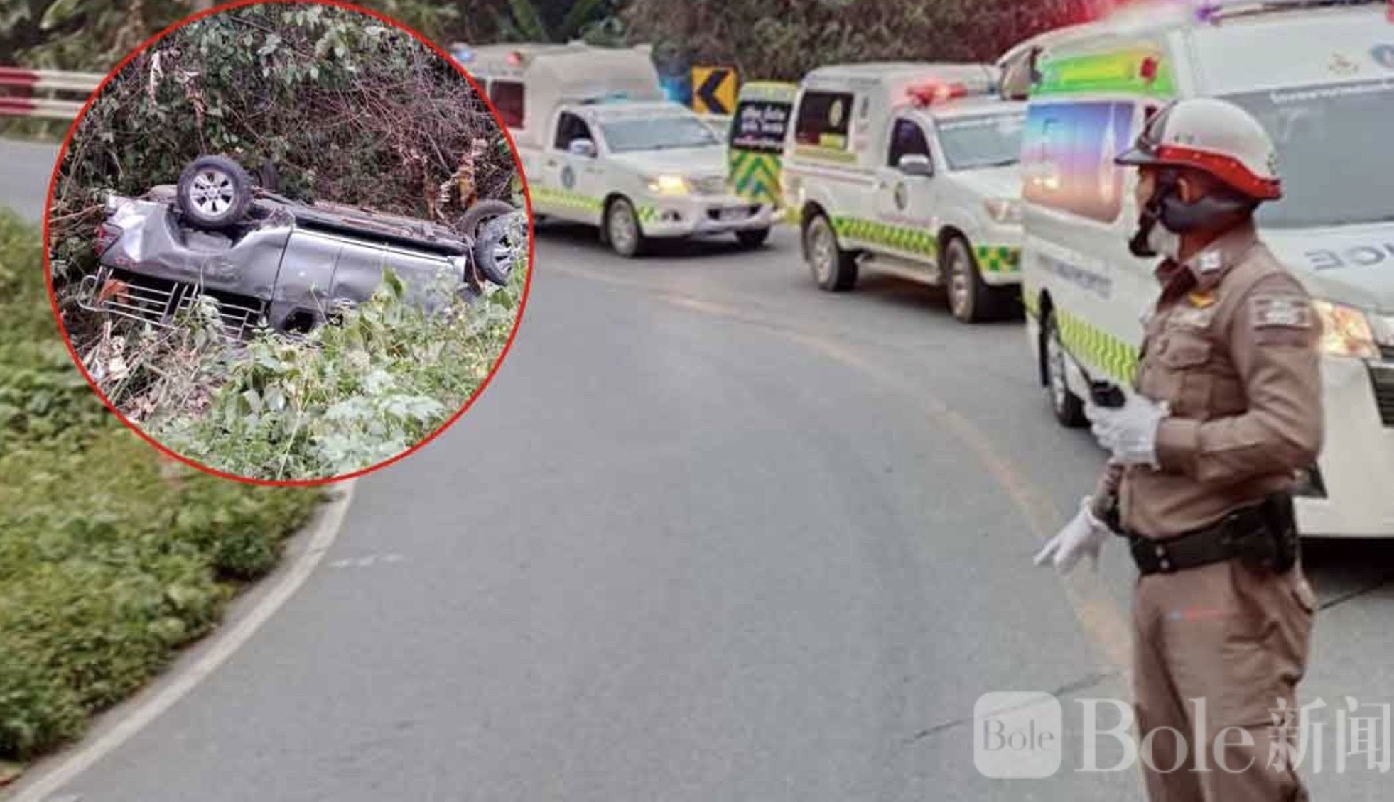 Bole新闻专讯:2026年4月18日,泰国媒体报道,泰国楠府府(南邦)一处山路急弯路段发生严重交通事故,一辆皮卡车在行驶过程中失控冲出弯道并发生翻覆,造成多人伤亡。