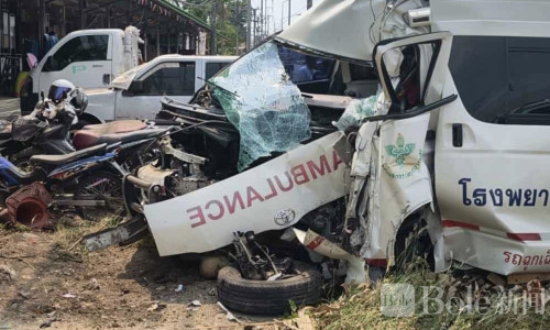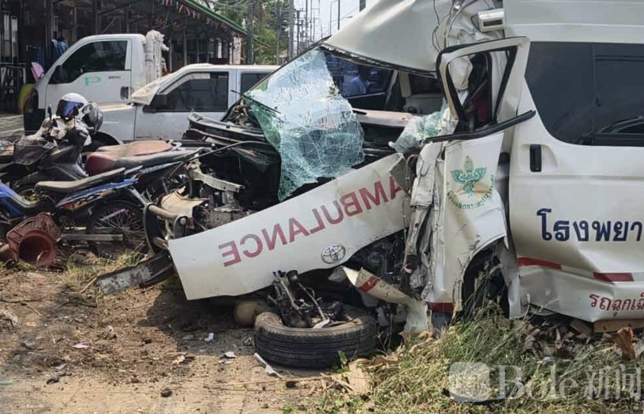 Bole新闻专讯:泰国四色菊府发生一起救护车交通事故,一辆转运救护车因司机连续值班过度疲劳,在行驶途中打瞌睡失控撞上电线杆,造成车内4人受伤,其中一名护士伤势严重,事件引发关注。