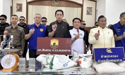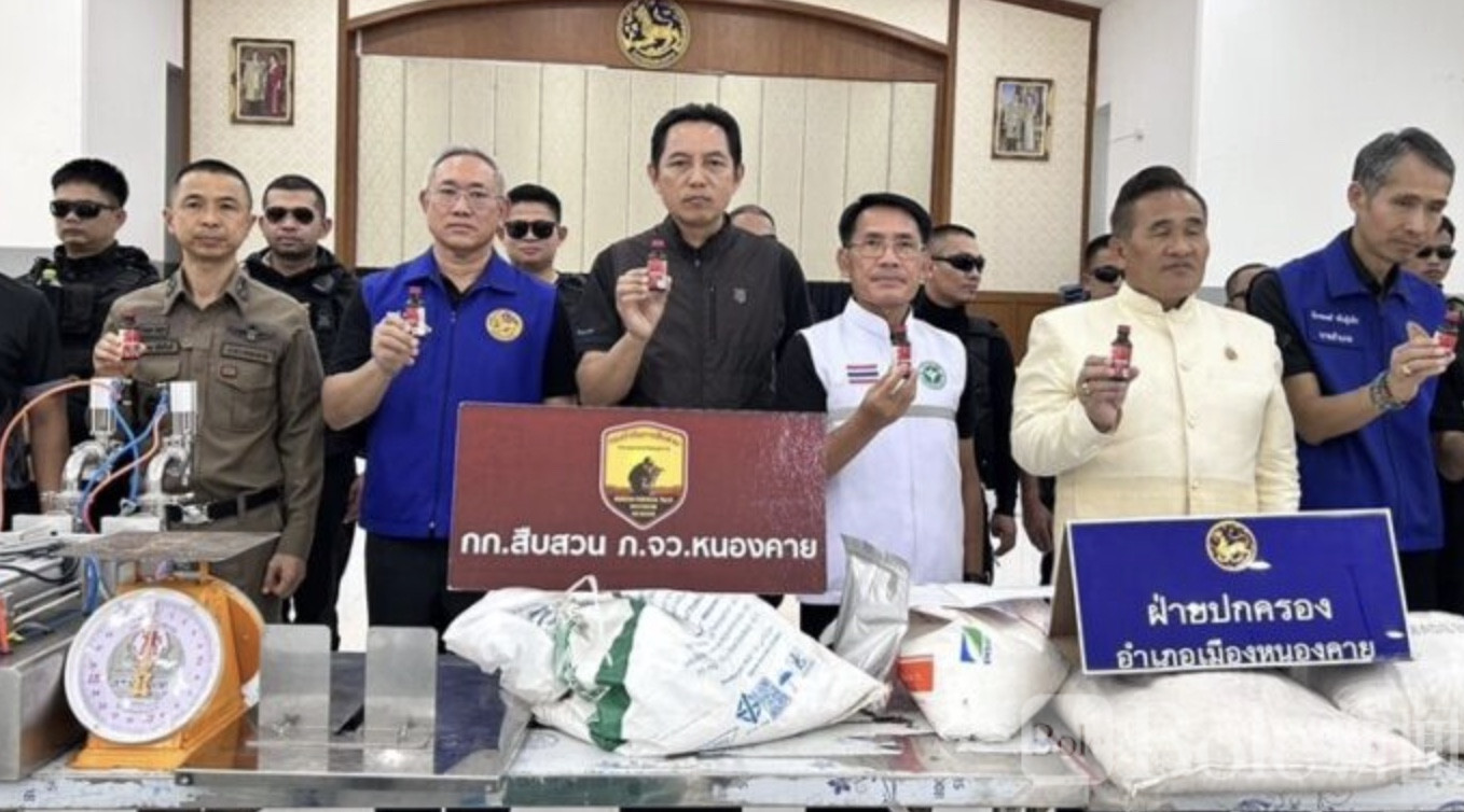 Bole新闻专讯:泰国廊开府近日展开一次联合执法行动,一处隐藏在出租屋内的地下“制药点”被彻底捣毁。现场不仅查获大量用于生产止咳药的原料和设备,还发现成批待装瓶的药液以及数万只空瓶。初步估算,这批非法产品及设备总价值超过550万泰铢,而这些所谓的“止咳药”,原本正准备通过网络渠道流向市场。