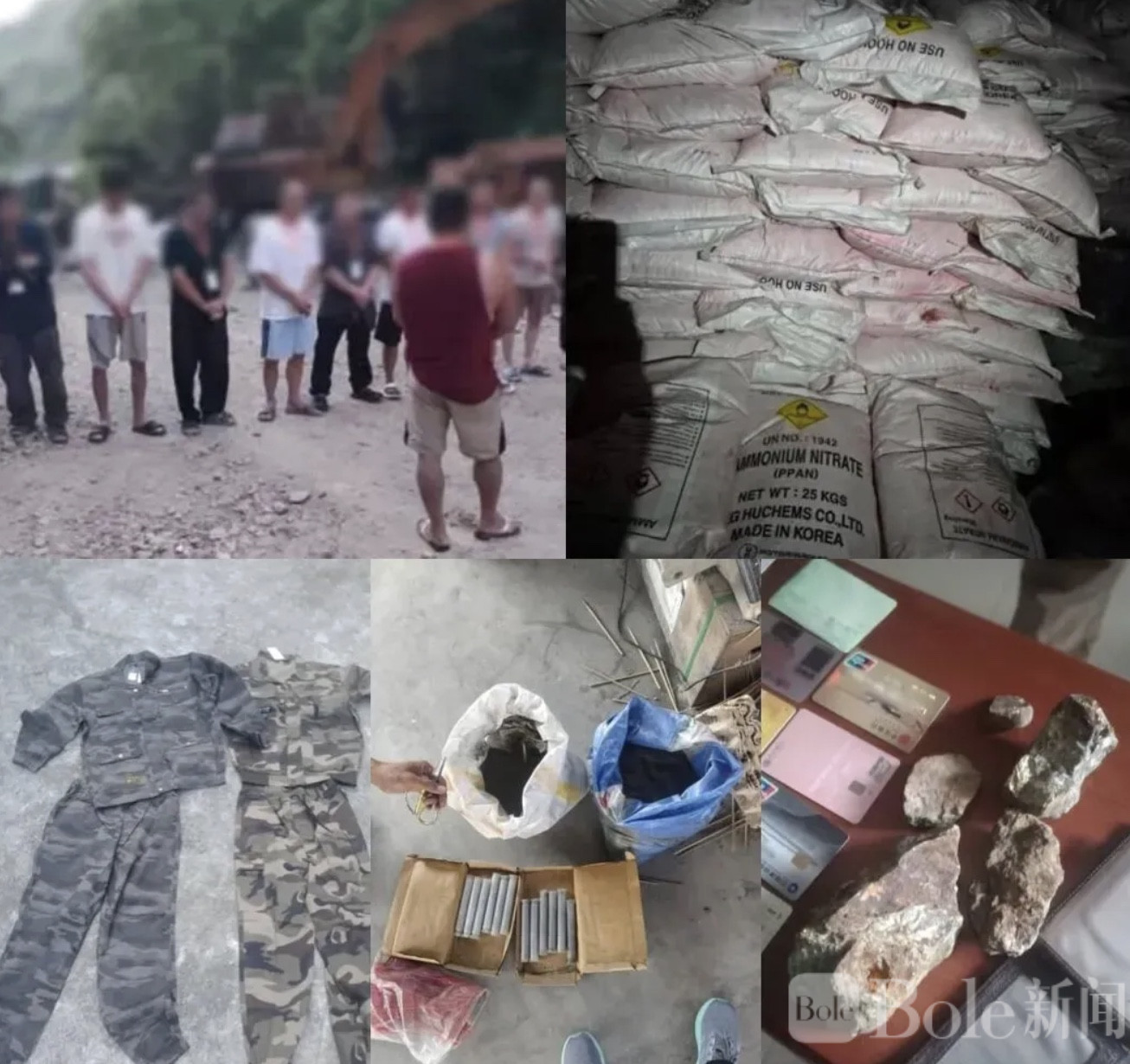 而事情远不止签证违规这么简单。顺着人员线索深挖之后,执法人员当场捣毁了由这批华人运营的非法采矿窝点,背后隐藏的地下采矿网络彻底暴露。现场搜查过程中,警方查获数量可观的矿产原料、大型重型开采设备,甚至还搜出了危险爆炸物品,以及多套中国制式军装,涉案情节远比单纯的签证逾期要严重得多。