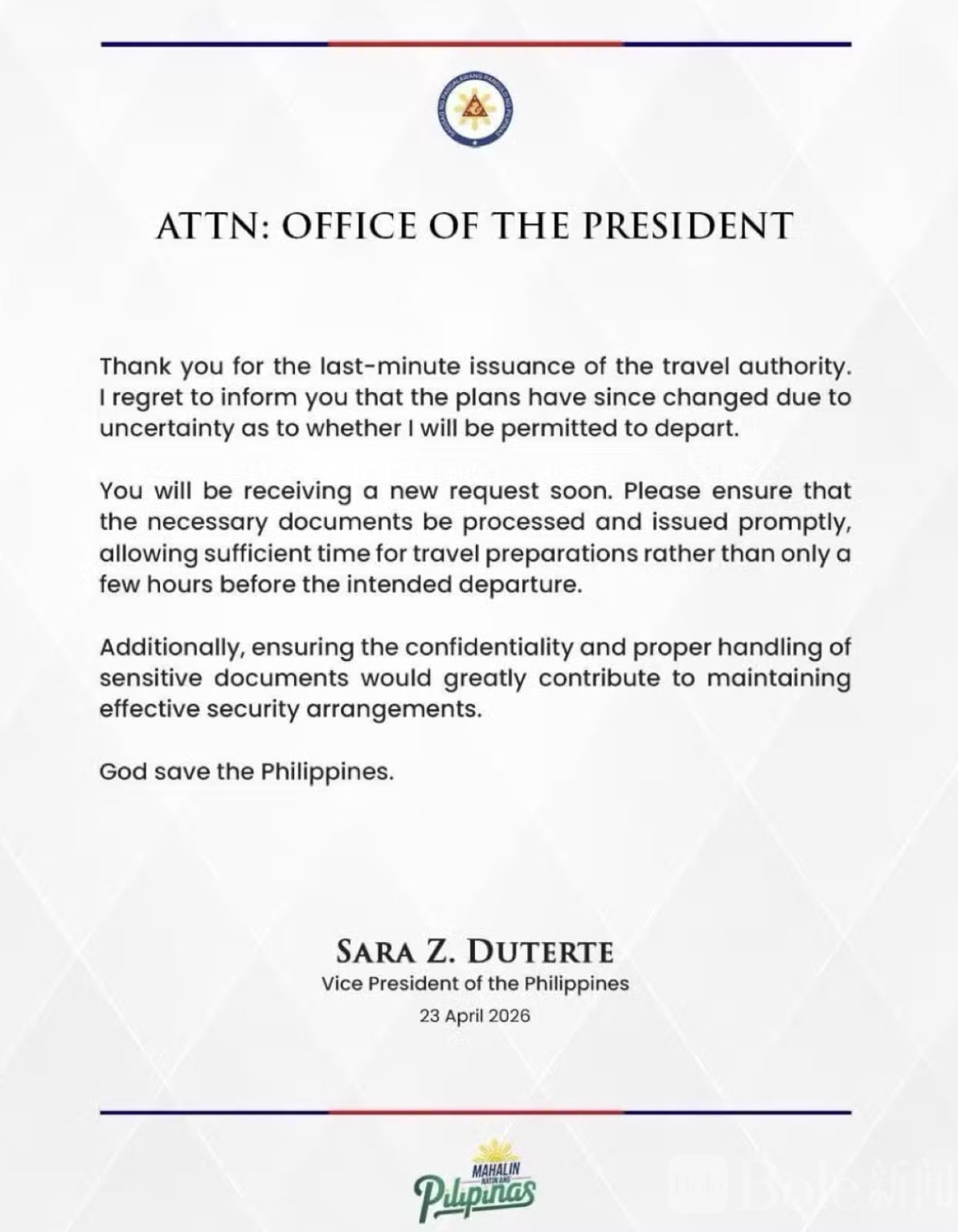 莎拉·杜特尔特在一份致总统办公室的声明中,对此前临时签发的旅行许可表示感谢,语气上算是先礼后兵,但话里也带着一点无奈——毕竟出行安排被打乱,总归不是件轻松的事。